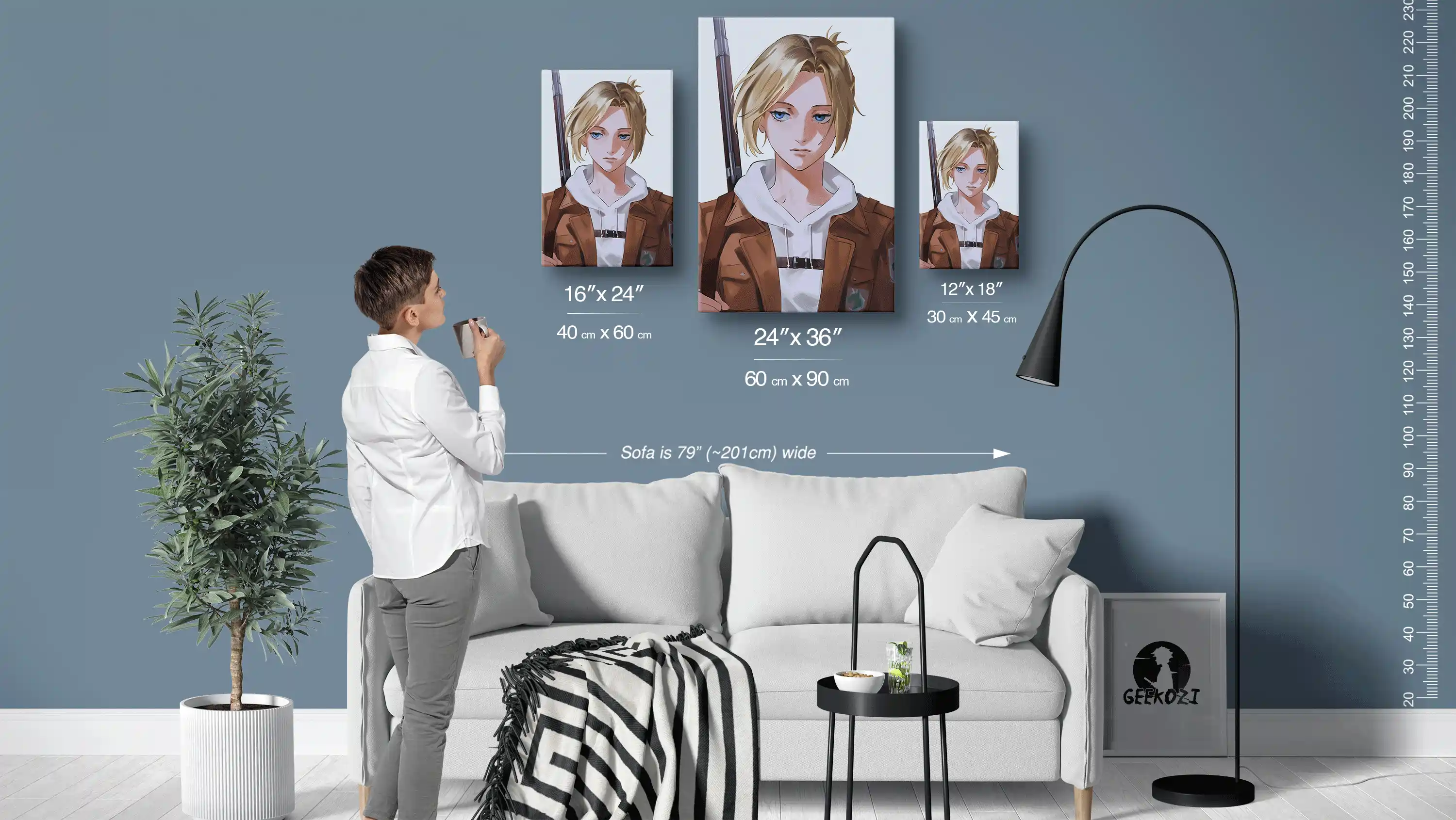 Bathed in soft, subdued lighting, the depiction of Annie Leonhart lends a serene yet commanding presence. The subdued earth tones of her military jacket contrast sharply with the delicate hues of her blonde hair and the cool blue of her eyes, creating a visual balance that captures the viewer’s attention. The lighting illuminates her from the left, casting subtle shadows that accentuate the intricate texture details of her attire and facial expressions. This careful interplay of light and shadow enhances the three-dimensional feel of the portrait and evokes a mood of quiet introspection and hidden strength.Annie Leonhart stands poised, her gaze penetrating yet distant, embodying a moment of calm before the storm. This pose references her dual nature as both a warrior and a complex character within the narrative of Attack On Titan, particularly highlighted during the Female Titan arc. Her expression conveys a blend of determination and melancholy, a testament to her struggles and the heavy responsibilities she bears. Fans of the series will recognize the depth of this moment, feeling the weight of her choices and the path she has chosen to walk alone.Ideal for adding a touch of introspective drama to a fan’s themed collection space.
