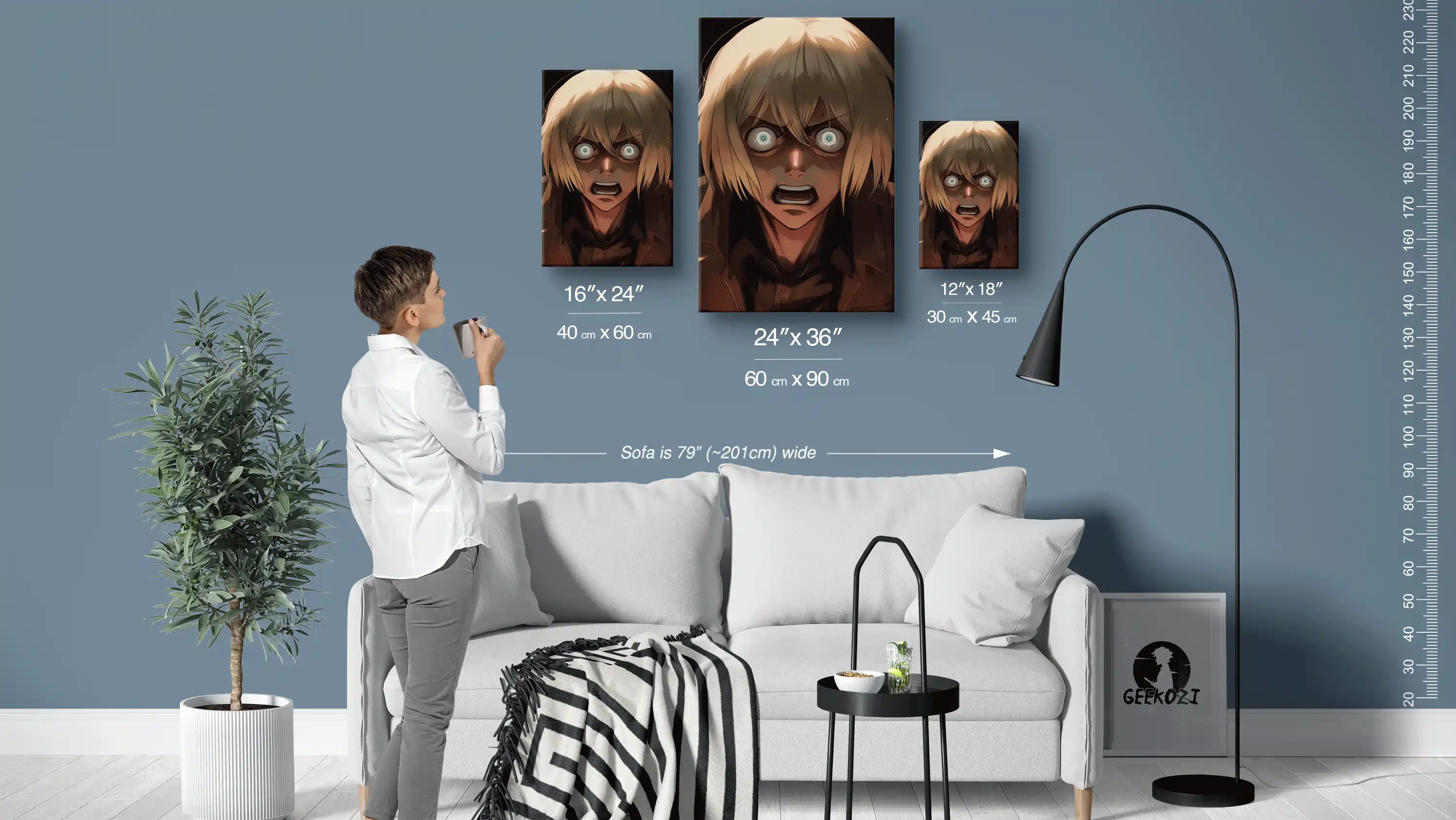 At Geekozi, our distinctive printed metal poster brings your favorite anime characters to life with stunning detail and vivid colors, thanks to our UV-cured six-colour printing. Choose from three finishes: the matte aluminum option features a low-glare, smooth look on 3 mm aluminum Dibond, the brushed aluminum adds a stylish metallic grain on 3 mm brushed silver Dibond, and our acrylic finish offers a glossy 4 mm acrylic glass that elevates depth and has polished edges. Each poster includes a slim magnetic plate and screws for easy display, so there’s no need for a frame or drilling. Available sizes are 12×18, 16×24, and 24×36.