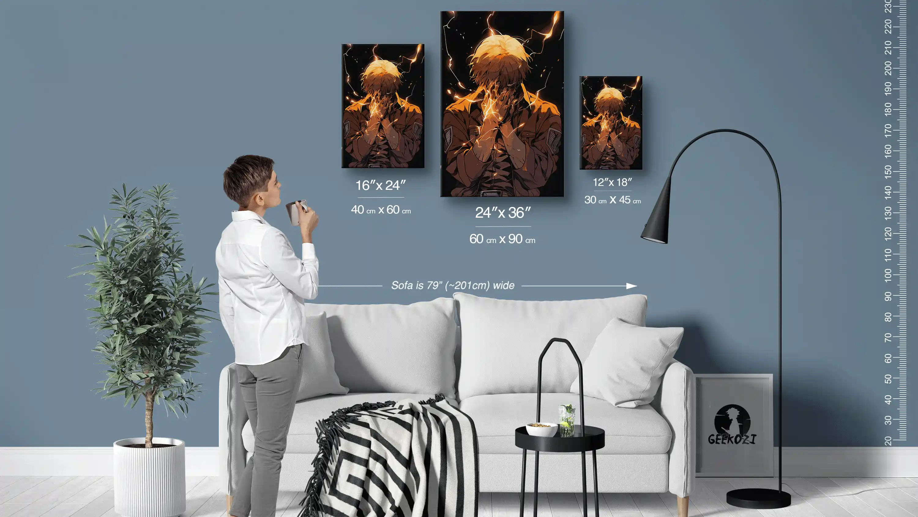 The Poignant Embers of Contemplation wall art comes in three captivating panel sizes: 12 inches by 18 inches, 16 inches by 24 inches, and 24 inches by 36 inches. To help you visualize, the sofa in the image above measures 79 inches wide, which is about 201 centimeters. For a cozy desk setup, the smallest size works perfectly, while the largest size makes a striking statement on a feature wall. Choosing the right size will enhance your space and showcase your passion for anime in the best way possible.