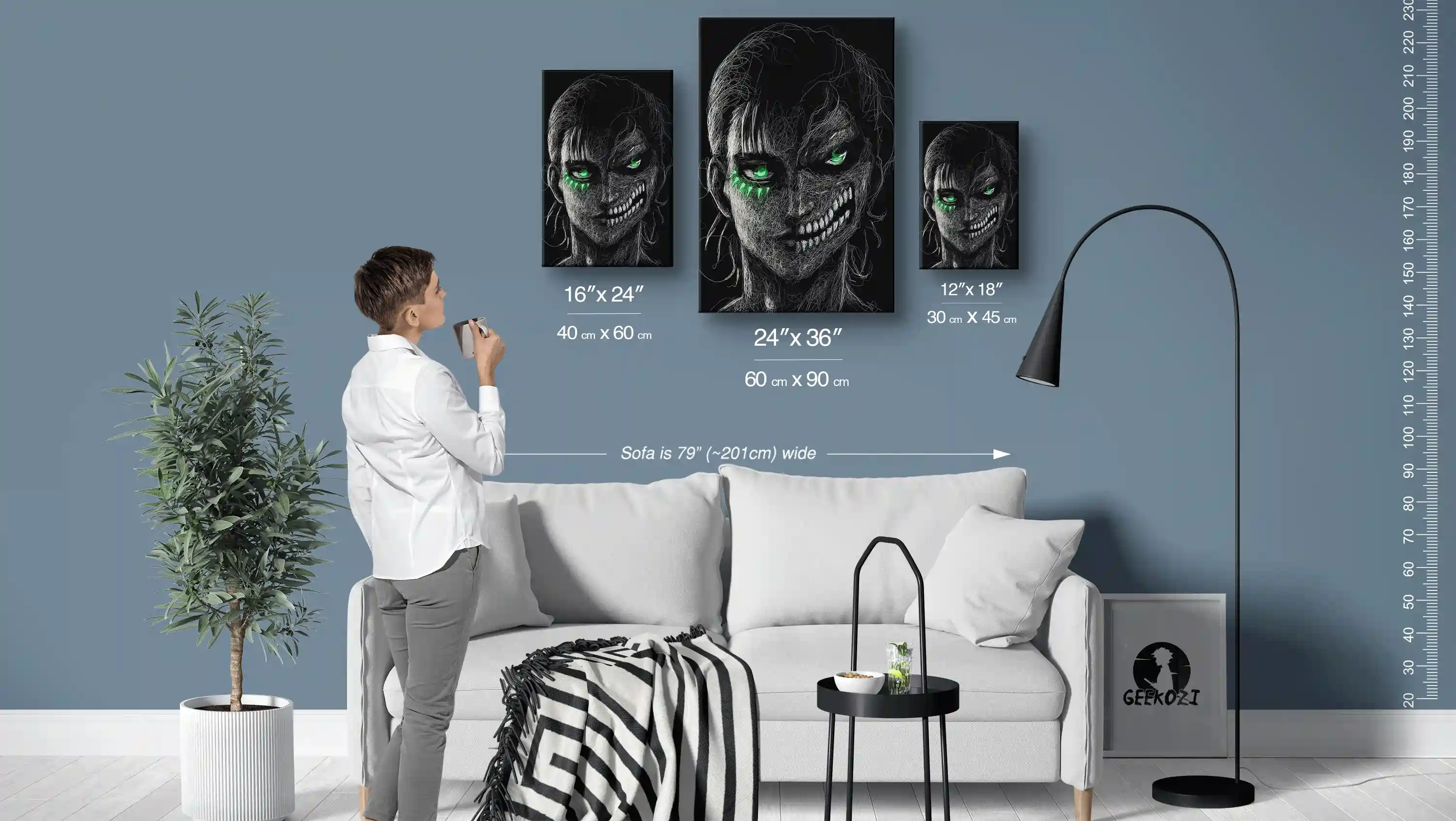 The Brooding Emerald Gaze is available in three sizes: 12×18 (30×45 cm), 16×24 (40×60 cm), and 24×36 (60×90 cm). The sofa in the image above is 79 inches (approximately 201 cm) wide, which can help you visualize how each size might fit in your space. For smaller areas like desks or side tables, the 12×18 size works well, while the larger 24×36 version makes a bold statement on feature walls. Choose the size that best complements your room’s design and layout for optimal impact.