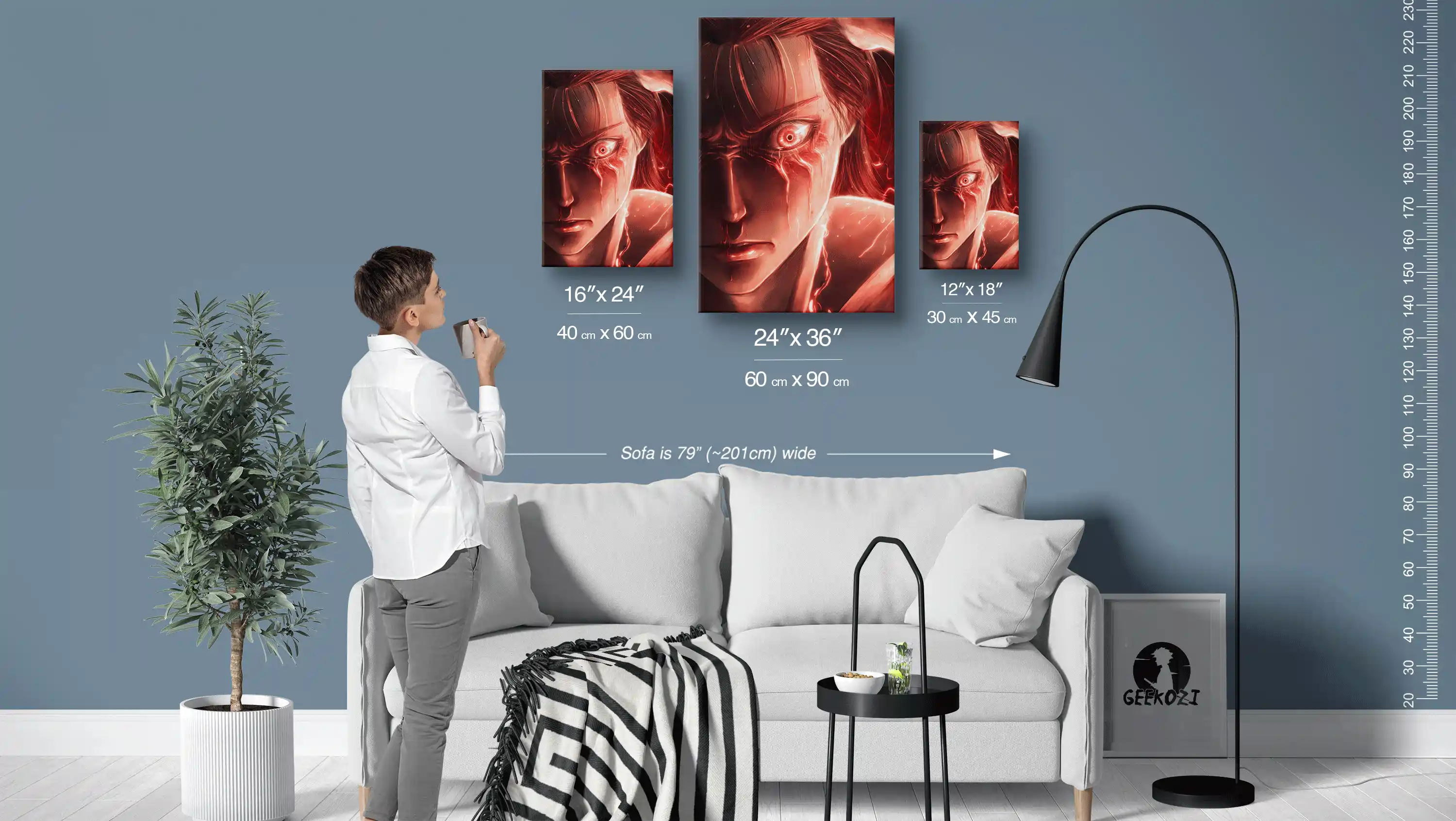 The Fiery Gaze Transformation Metal Print Poster captures the essence of anime art with its striking visuals, available in three sizes: 12×18 (30×45 cm), 16×24 (40×60 cm), and 24×36 (60×90 cm). To help you judge scale, keep in mind that the sofa in the image above is 79 inches wide, which is roughly 201 cm. For smaller spaces like desks or cozy nooks, the smallest size works best, while the largest size makes a bold statement on feature walls, creating an eye-catching focal point in any room. Choose the size that complements your space and enhances your decor.
