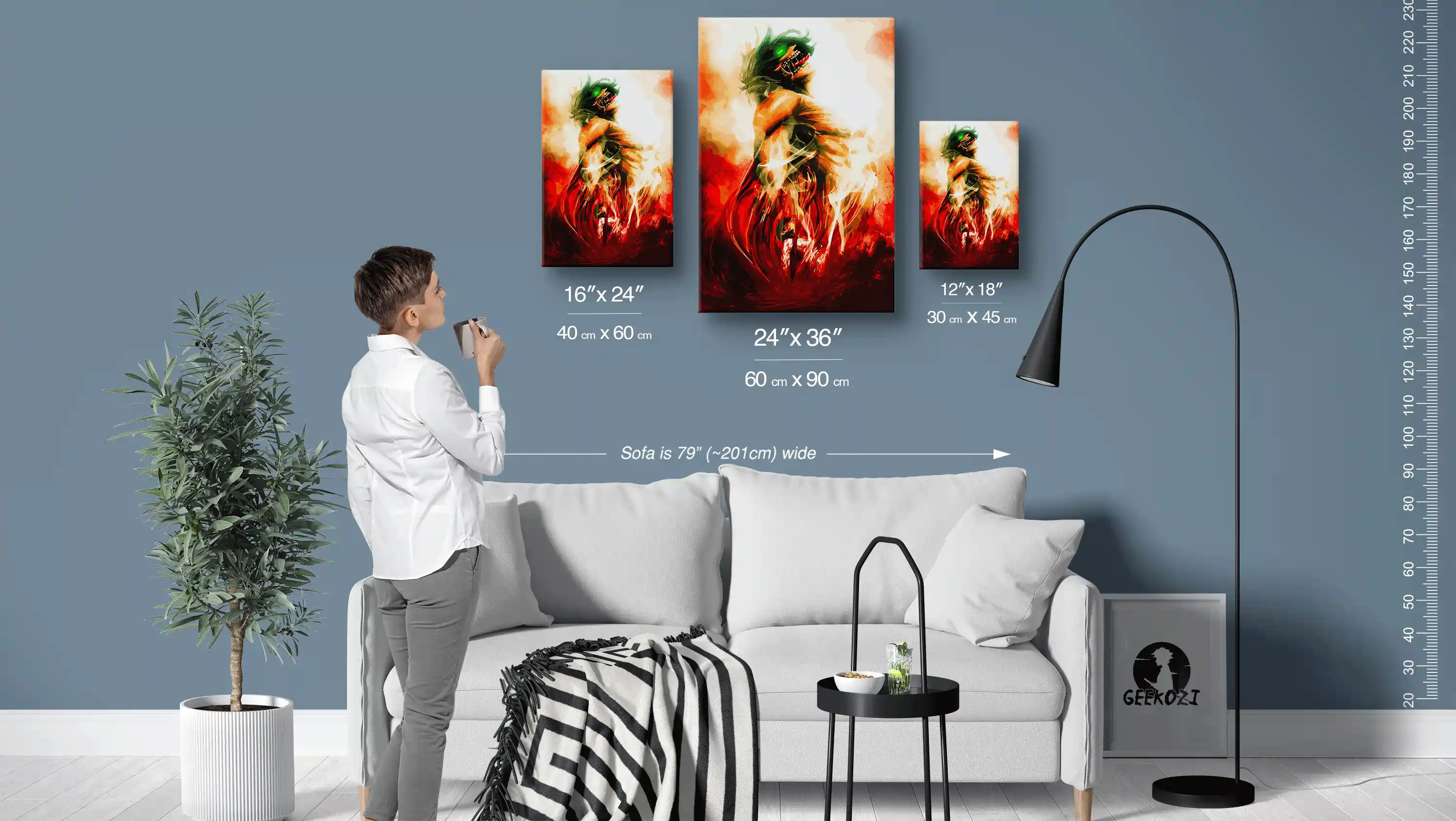 The Fiery Titan Transformation Metal Print Wall Art is a striking addition to your home décor, available in three panel sizes: 12×18 (30×45 cm), 16×24 (40×60 cm), and 24×36 (60×90 cm). To help you gauge the scale, the sofa in the image above measures 79 inches (approximately 201 cm) wide. When choosing a size, consider placing the smallest option on a desk or shelf, the medium for a cozy nook, and the largest piece for an impressive feature wall that captures attention and adds flair to your space.