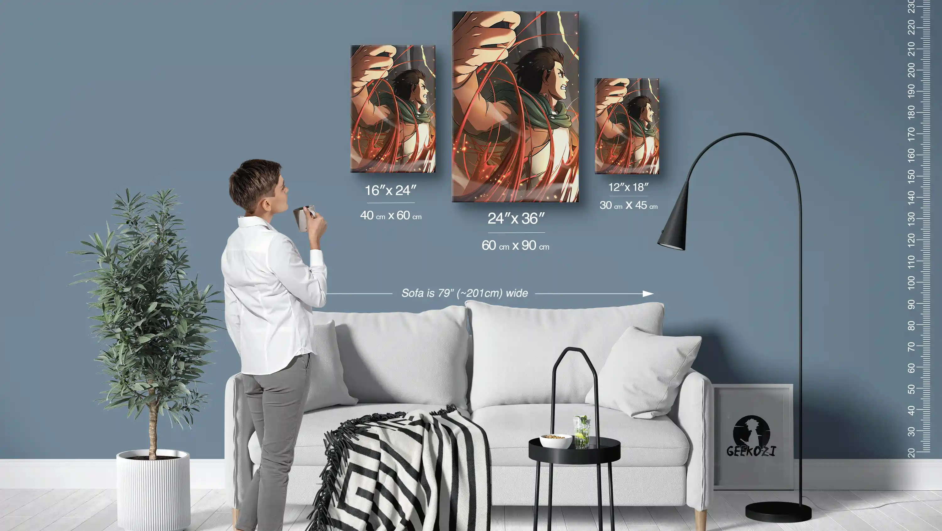 The Fiery Transformation Forward-Leaning Scene is an eye-catching piece that can elevate any space. Available in three sizes, 12×18 (30×45 cm), 16×24 (40×60 cm), and 24×36 (60×90 cm), it can fit various settings from small desks to larger feature walls. To help you visualize its placement, the sofa in the image above is 79 inches (approximately 201 cm) wide, giving you a sense of scale. For smaller areas like workspaces, the 12×18 size might be ideal, while the 24×36 option makes a bold statement in living rooms or galleries. Consider your furniture and wall space when making your choice for the best fit.