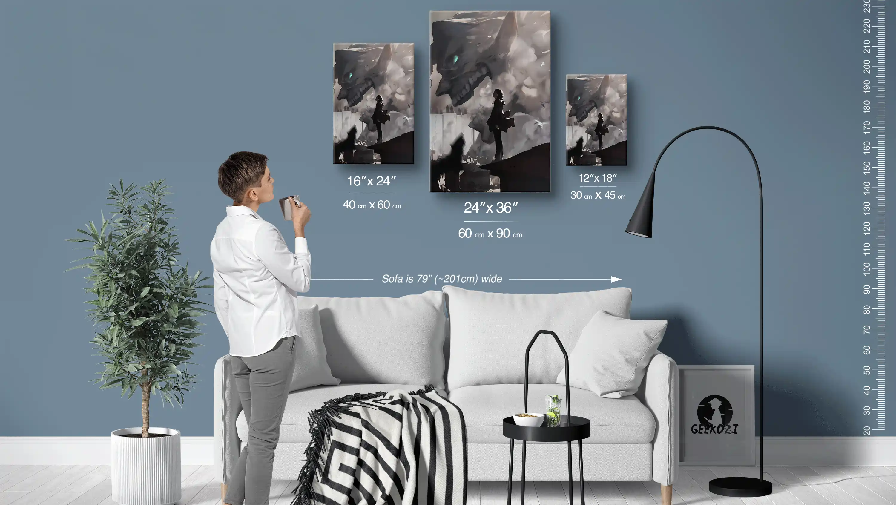 Transform your space with the striking Haunting Moonlight Titan Confrontation, available in three panel sizes: 12×18 (30×45 cm), 16×24 (40×60 cm), and 24×36 (60×90 cm). To help you judge scale, the sofa in the image above measures 79 inches (approximately 201 cm) wide. For a cozy nook, consider the smallest size, perfect for desks or small spaces, while the largest size makes a bold statement on feature walls. Whether you’re an anime aficionado or just looking to elevate your décor, this artwork provides a captivating focal point that captures the essence of your style.