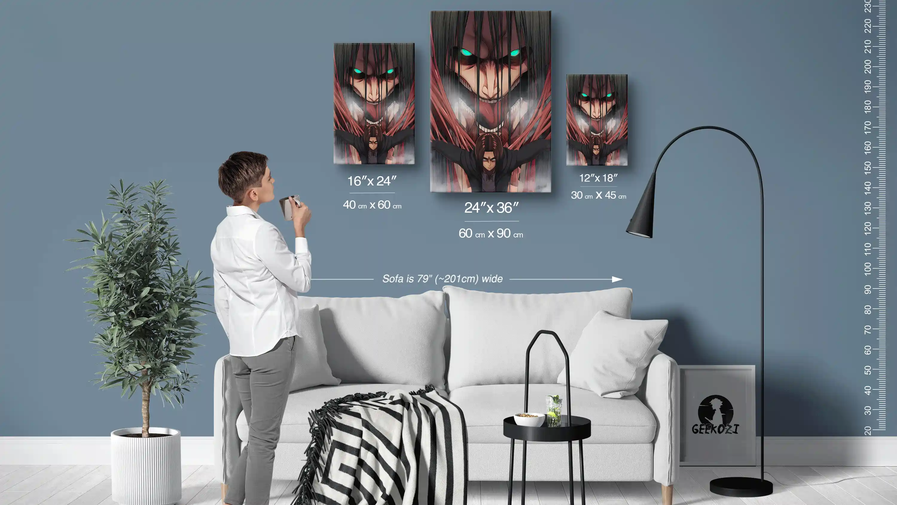 The Haunting Titan Grin is an impressive piece of wall art that comes in three sizes: 12×18 (30×45 cm), 16×24 (40×60 cm), and 24×36 (60×90 cm). In the image above, the sofa is 79 inches wide, which should help you visualize how the art will fit in your space. For smaller areas like desks or cozy nooks, the smallest size works well, while the largest size can truly stand out as a focal point on feature walls. Choose the panel size that best complements your space and reflects your personal style.