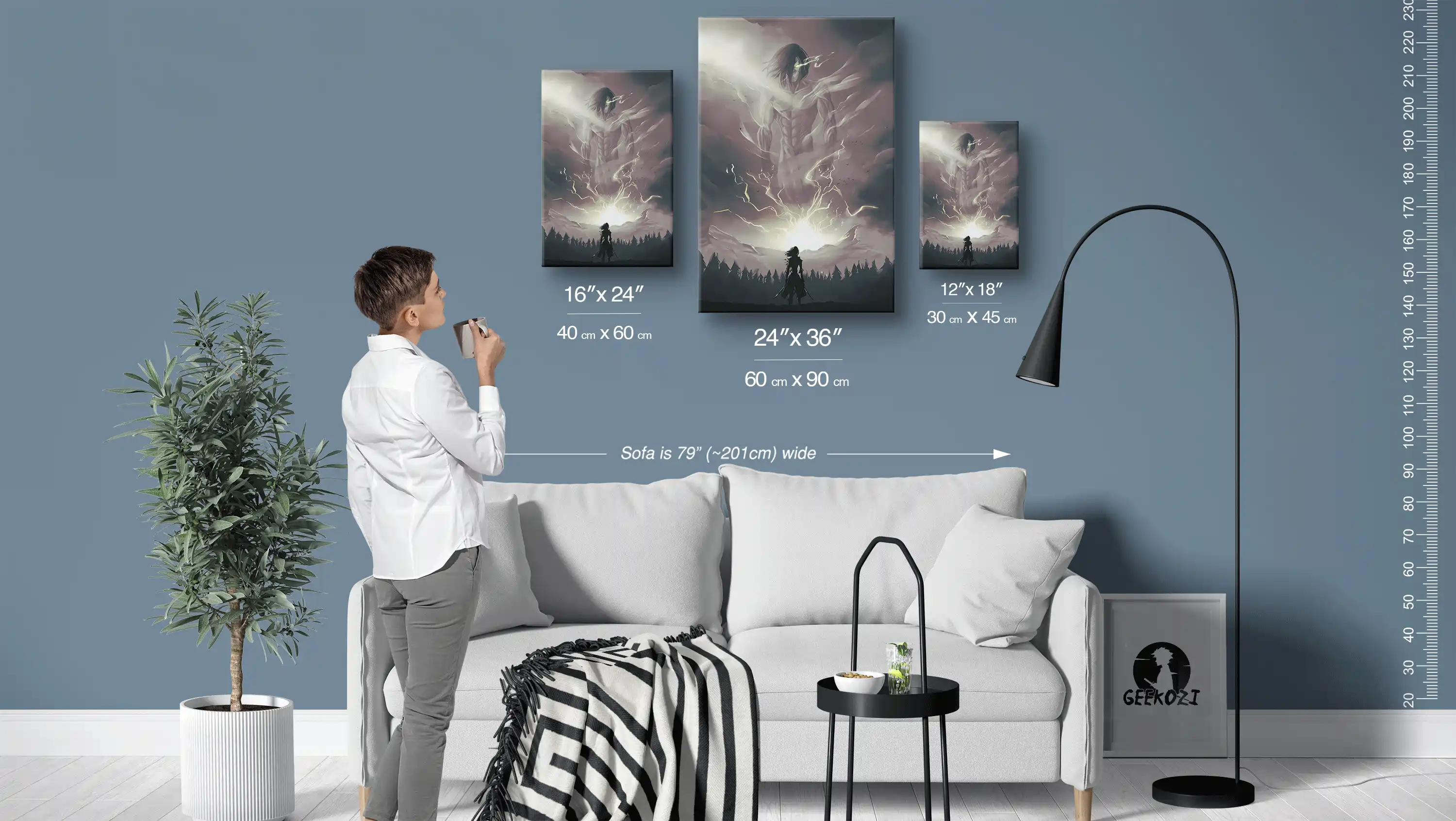 The Haunting Titan Transformation brings a striking presence to your space, available in three panel sizes: 12×18 (30×45 cm), 16×24 (40×60 cm), and 24×36 (60×90 cm). For reference, the sofa in the image above is 79 inches (approximately 201 cm) wide, which can help you gauge the scale of your chosen size. If you’re looking to add a piece to a small desk, the smallest size would be a perfect fit, while the largest size makes a bold statement on a feature wall. Choose the size that best complements your decor and lifestyle.