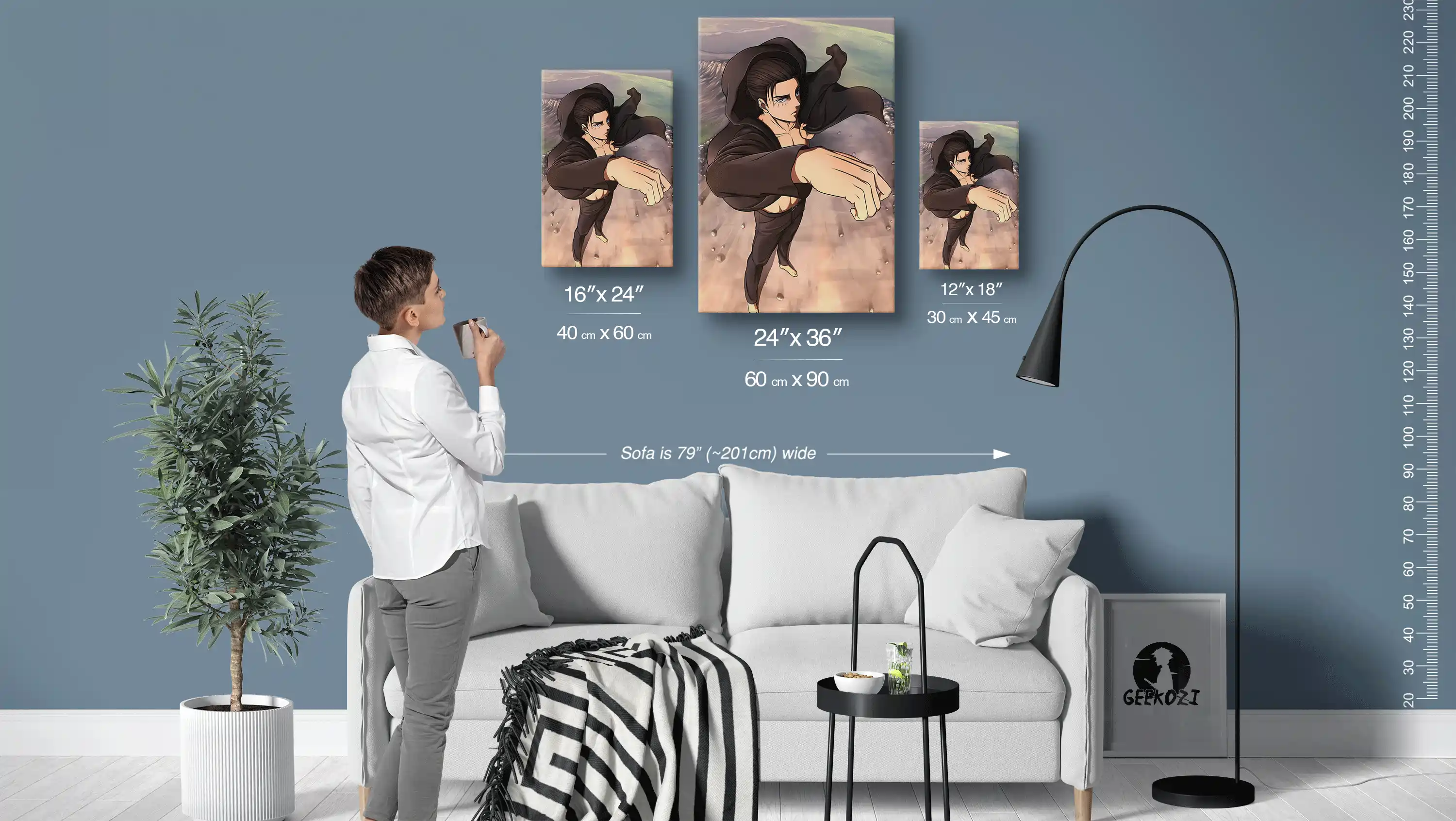 Transform your space with the Ominous Skyward Ascent, available in three panel sizes: 12×18 (30×45 cm), 16×24 (40×60 cm), and 24×36 (60×90 cm). To help you visualize the sizes, the sofa in the image above measures 79 inches (≈201 cm) wide. For smaller areas like desks or nooks, the 12×18 size works well, while the larger 24×36 option makes a striking statement on feature walls. Choose the size that best complements your space and showcases your love for anime art.