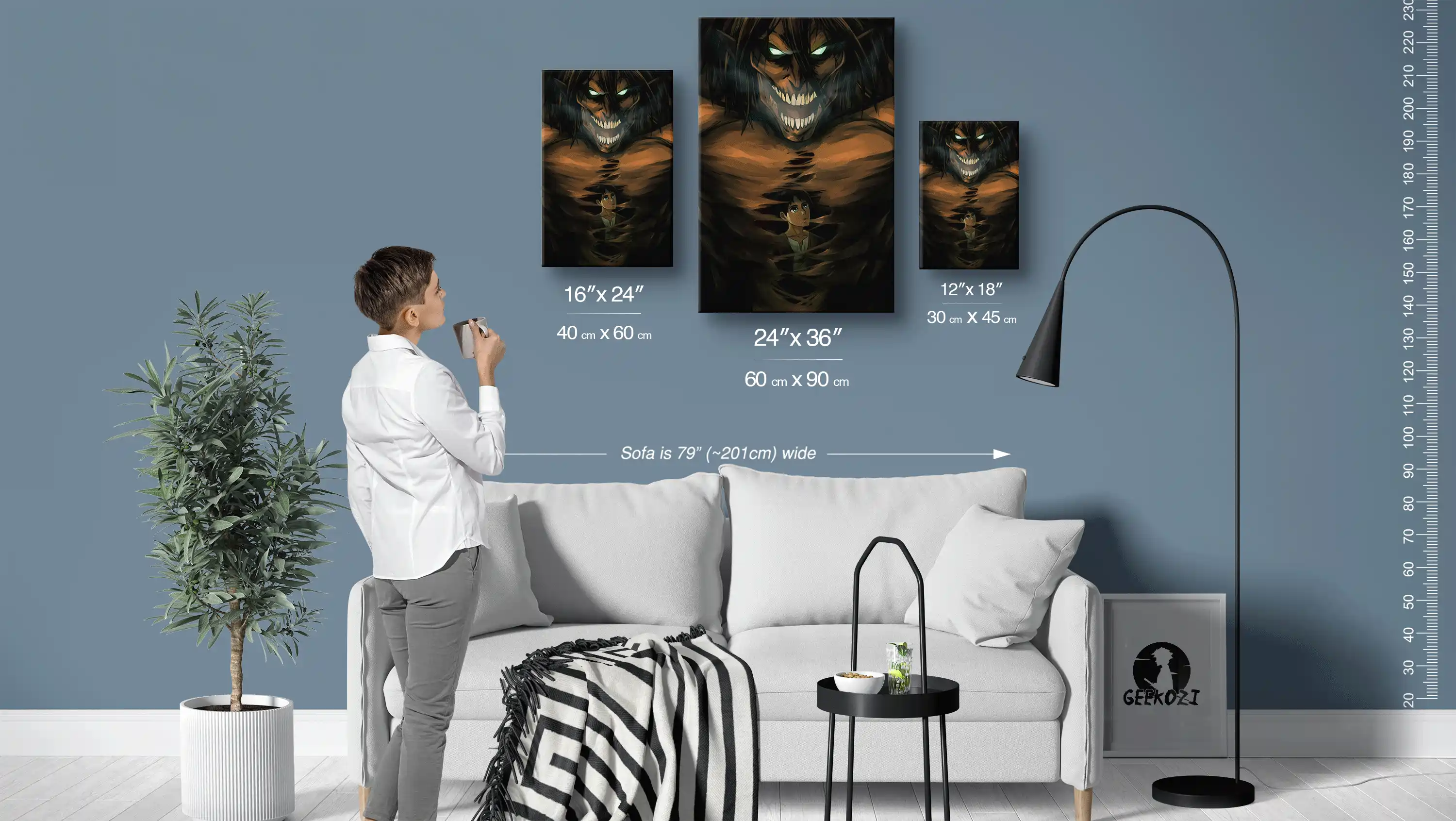 The Ominous Titan Transformation brings a striking focal point to any room with its bold design. Available in three sizes, you can choose from 12×18 (30×45 cm), 16×24 (40×60 cm), or 24×36 (60×90 cm) to fit your space perfectly. To give you an idea of scale, the sofa in the image above is 79 inches (approximately 201 cm) wide. For a cozy desk setup, the smallest size works well, while the largest size makes a stunning impact on feature walls. Select the size that best complements your decor and personal style.