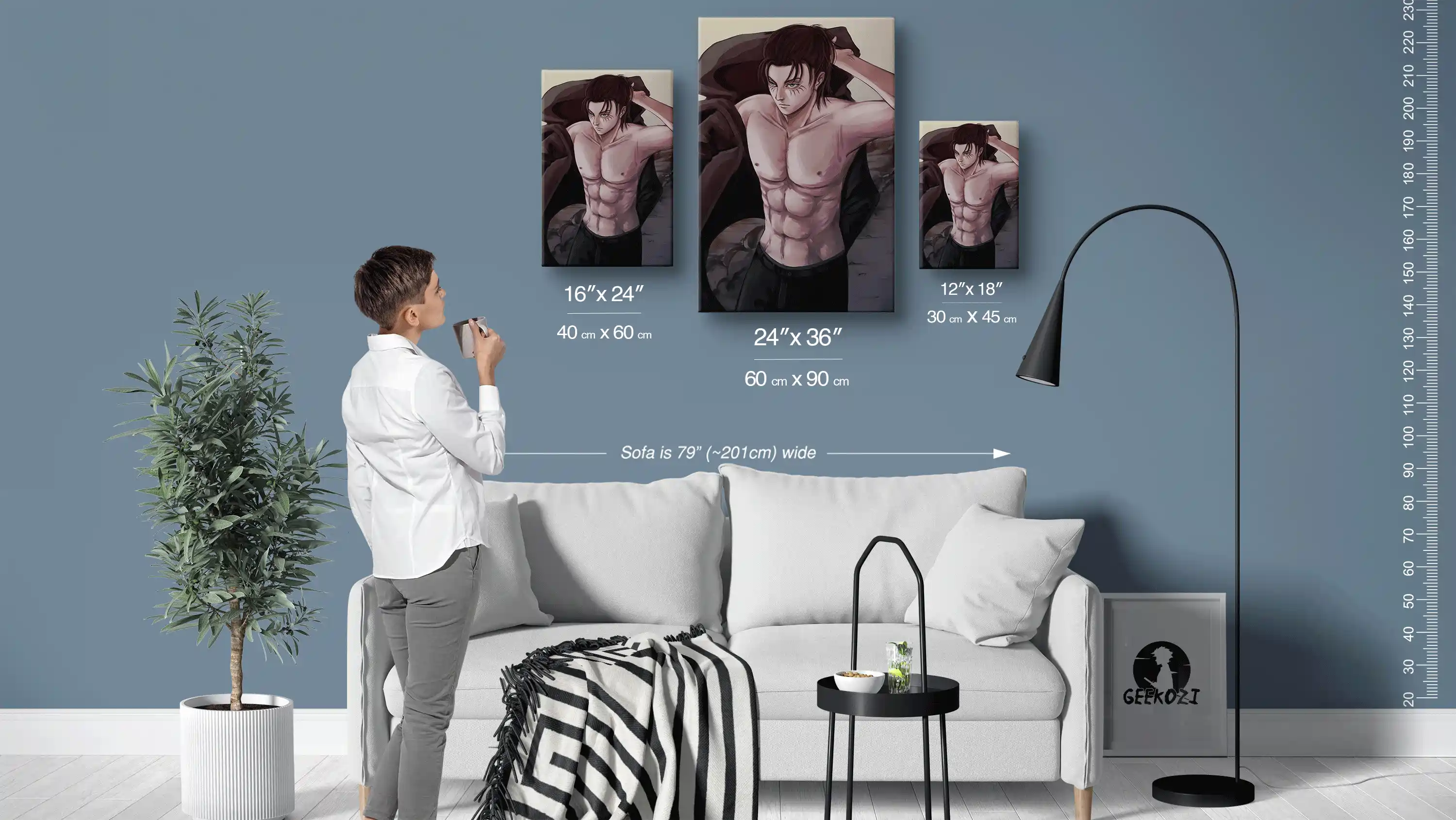 The Solemn Twilight Transformation Metal Print Wall Art is available in three sizes: 12×18 (30×45 cm), 16×24 (40×60 cm), and 24×36 (60×90 cm). To help you visualize, the sofa shown in the image above measures 79 inches (approximately 201 cm) wide. A good tip for picking the right size is to choose the smallest option for desks or smaller spaces, while the largest size works beautifully as a statement piece on a feature wall. Select the size that best fits your space and style to create an eye-catching display.