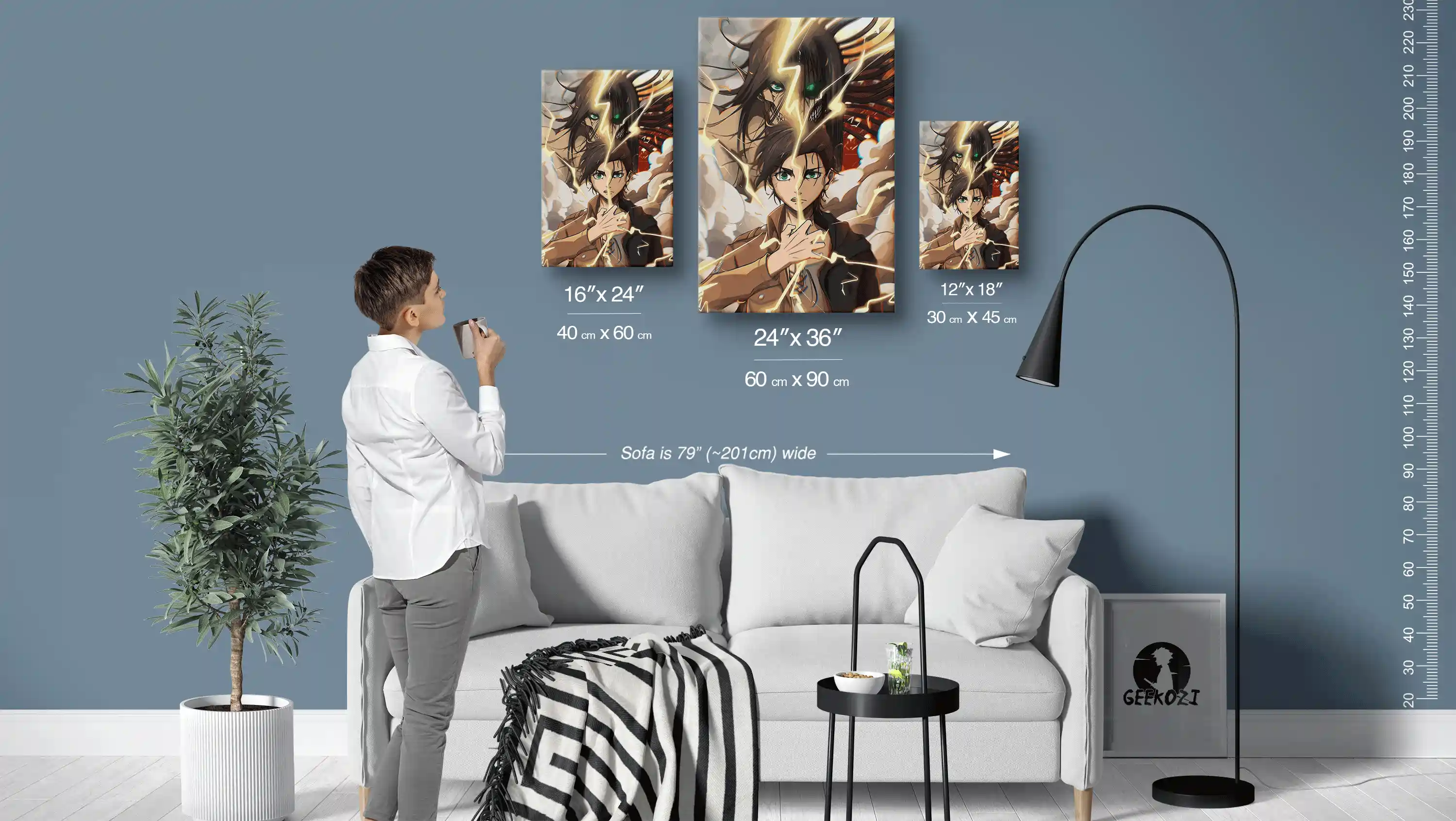 The Stormy Titan Awakening Metal Poster is available in three striking panel sizes: 12×18 (30×45 cm), 16×24 (40×60 cm), and 24×36 (60×90 cm). In the image above, the sofa measures 79 inches (approximately 201 cm) wide, providing a helpful reference for scale. For those looking to showcase this captivating artwork, the smaller size works great on desks or shelves, while the largest option is perfect for making a statement on feature walls. Choose a size that complements your space and brings your love of anime to life in a bold way.