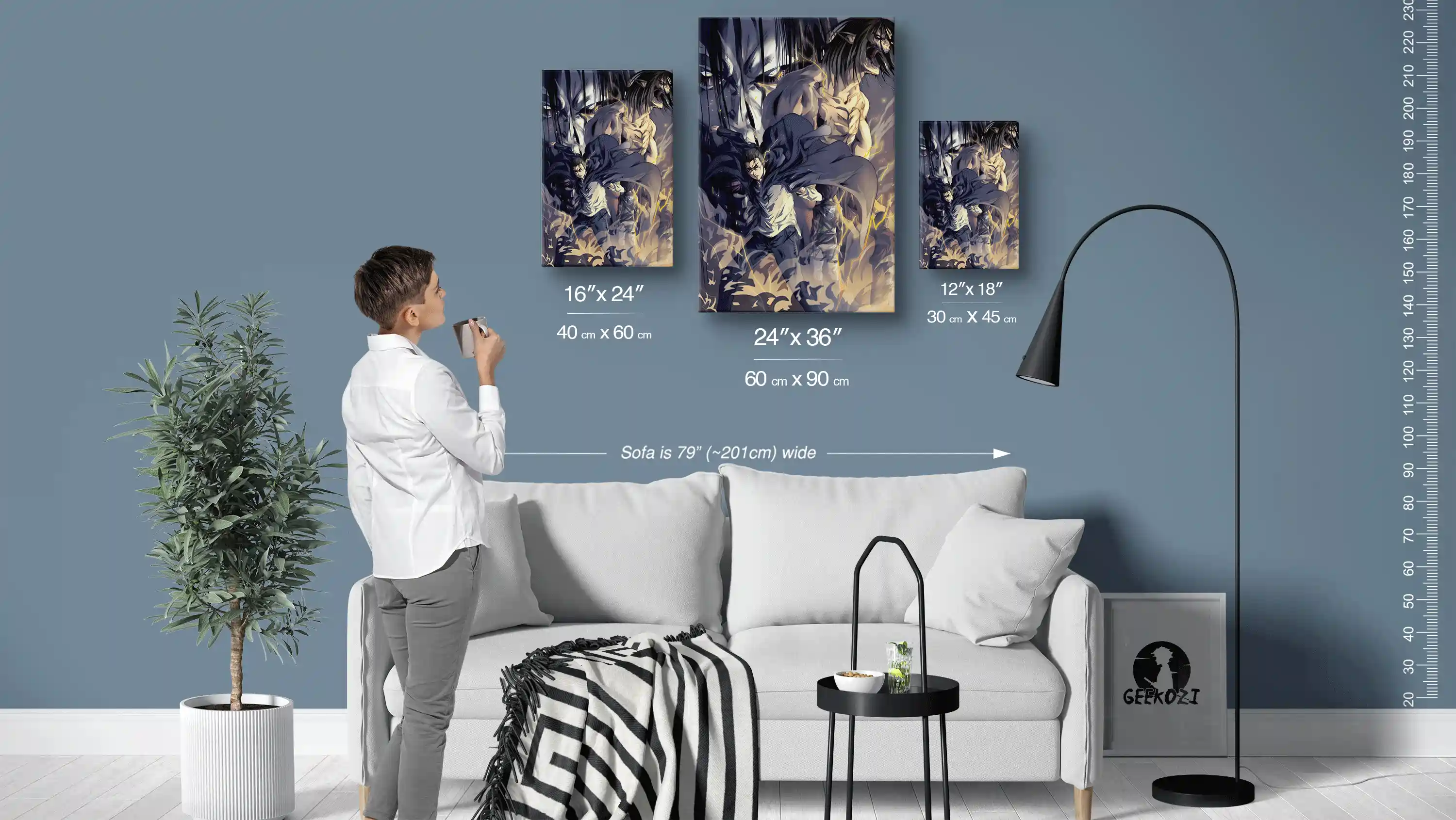 The Stormy Titan Transformation is a stunning piece of anime metal wall art available in three panel sizes: 12×18 (30×45 cm), 16×24 (40×60 cm), and the impressive 24×36 (60×90 cm). To help you gauge the scale, the sofa in the image above measures 79 inches (approximately 201 cm) wide. For smaller spaces like desks or study areas, the smallest size works perfectly, while the largest size makes a bold statement on feature walls. Consider your space and choose the size that best complements your home decor style and the area you want to enhance.