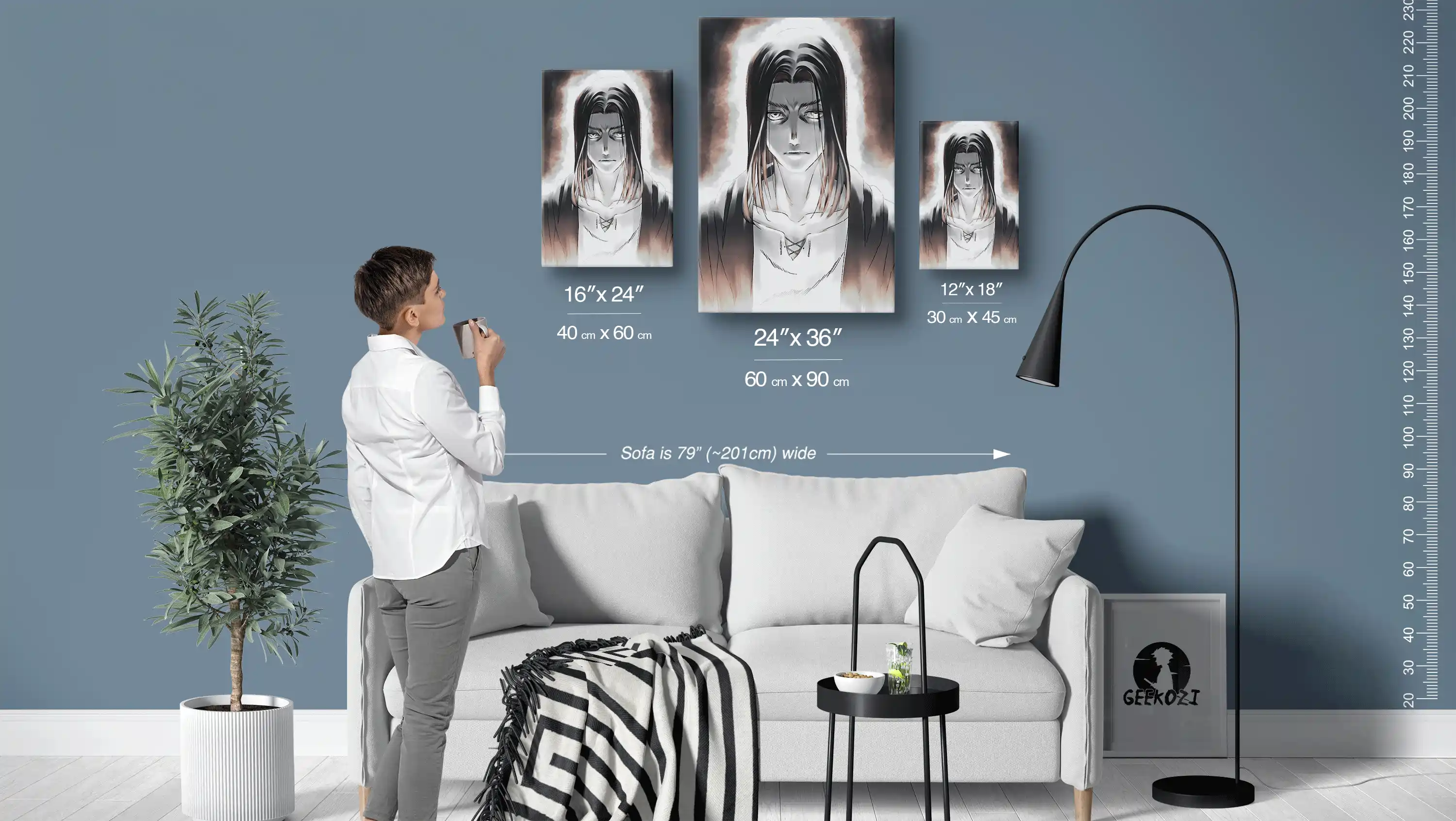 Transform your space with the Turbulent Clouds Defiant Stance, available in three sizes: 12×18 (30×45 cm), 16×24 (40×60 cm), and 24×36 (60×90 cm). The sofa in the image above measures 79 inches (approximately 201 cm) wide, helping you visualize the art’s scale in your own home. For smaller spaces like desks or nooks, the 12×18 option works beautifully, while the 24×36 size makes a stunning statement for larger feature walls, creating an eye-catching focal point. Choose the size that best fits your unique space to let your love for anime shine.
