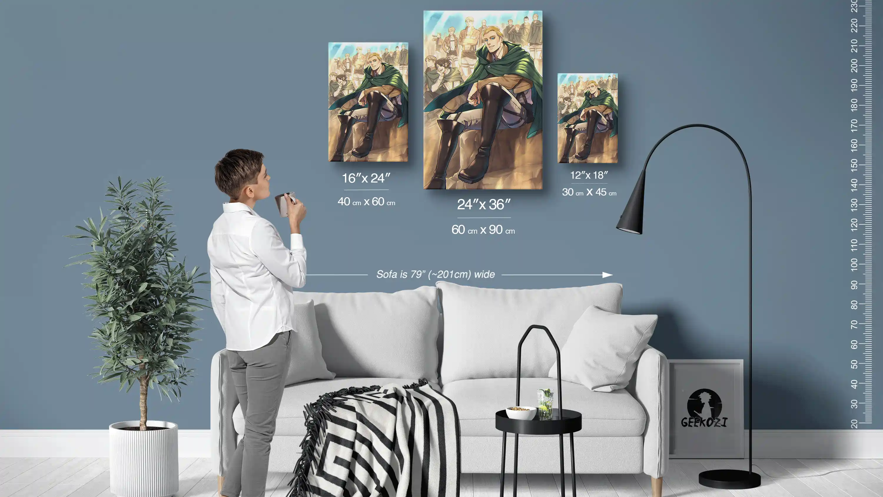 The Golden Sunrise over Iconic Green Cloak is available in three stunning panel sizes: 12×18 (30×45 cm), 16×24 (40×60 cm), and 24×36 (60×90 cm). To help you gauge the right size for your space, the sofa in the image above measures 79 inches wide, giving you a clear reference. For smaller spots like desks or accent walls, the 12×18 option works well, while the largest 24×36 panel makes a bold statement on feature walls. Choosing the right size can transform your room and bring the beauty of anime art into your home.