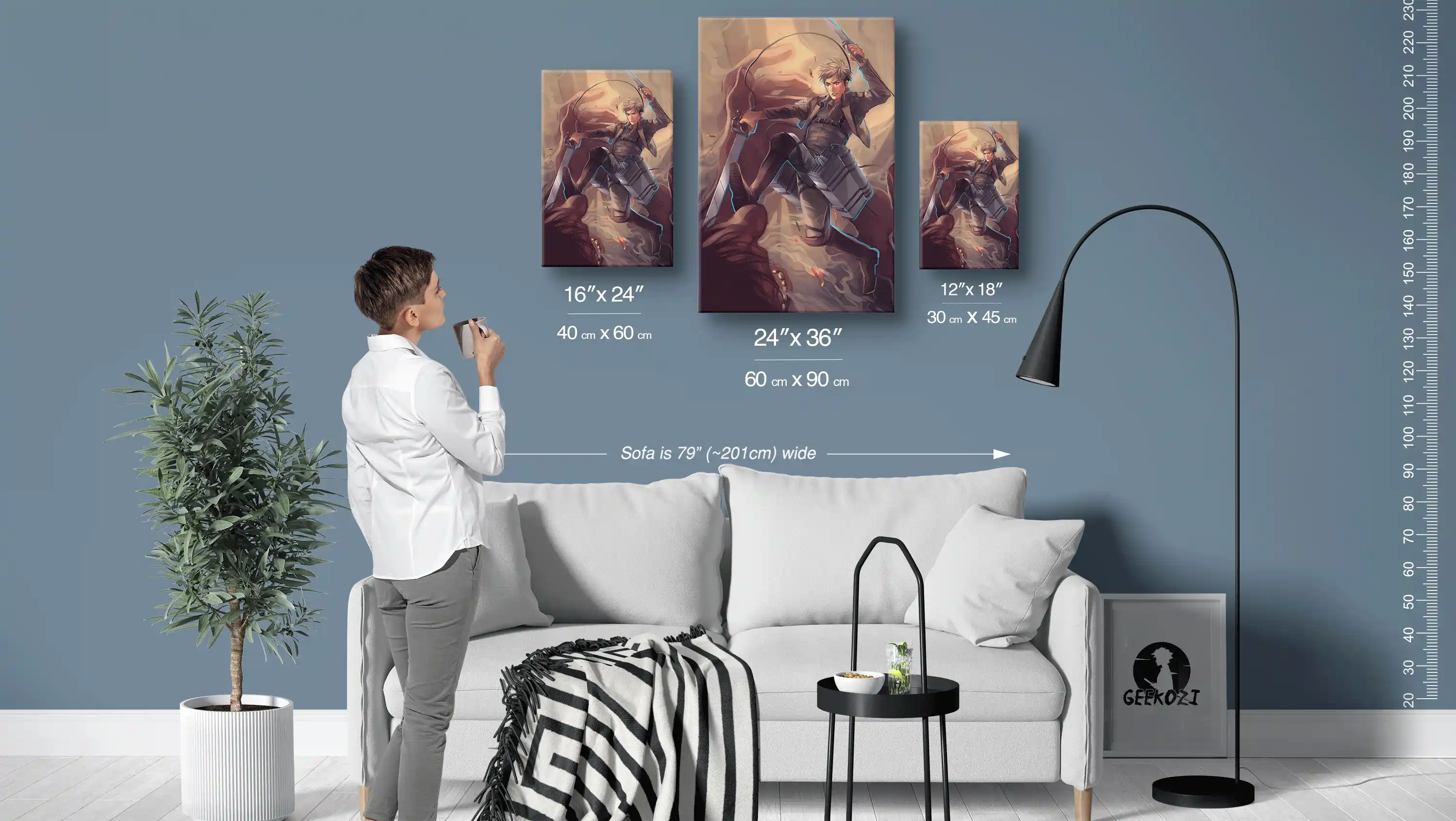 Dynamic Dust and Gear is available in three panel sizes: 12×18 (30×45 cm), 16×24 (40×60 cm), and 24×36 (60×90 cm). The sofa in the image above is 79 inches wide, giving you a great reference for scale as you decide on the perfect fit for your space. For smaller areas like desks, the 12×18 size works well, while the largest 24×36 option is ideal for making a bold statement on feature walls. Consider how much wall space you want to fill and choose accordingly to create a striking visual impact in your home.