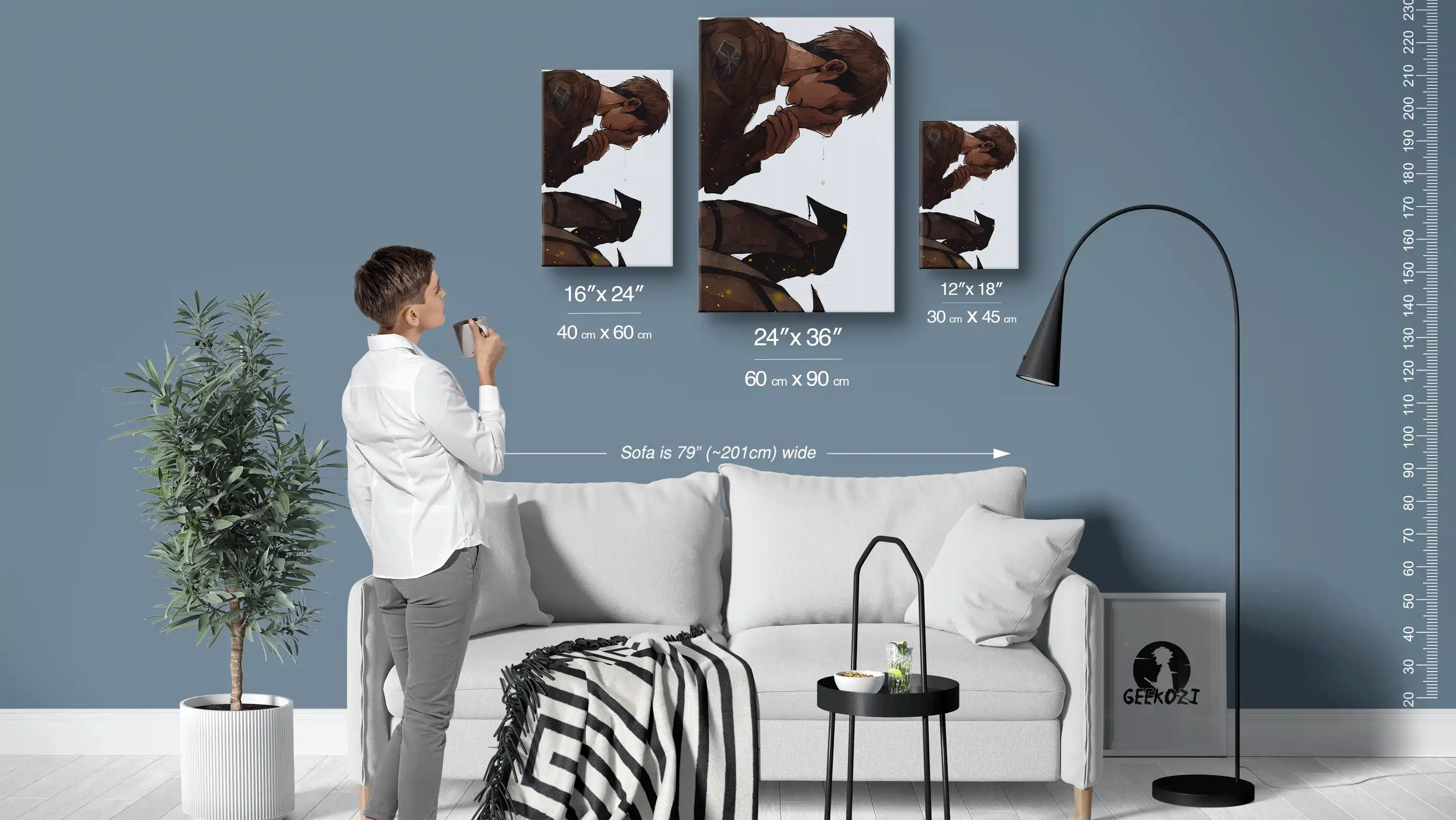 The Poignant Contemplation Moment wall art is available in three sizes: 12×18 (30×45 cm), 16×24 (40×60 cm), and 24×36 (60×90 cm). To help you visualize the scale, the sofa in the image above measures 79 inches (approximately 201 cm) wide. For a cozy spot like a desk, you might prefer the smallest size, while the largest is perfect for making a statement on a feature wall. Each piece adds a unique touch that resonates with anime enthusiasts, creating a captivating atmosphere in any space.