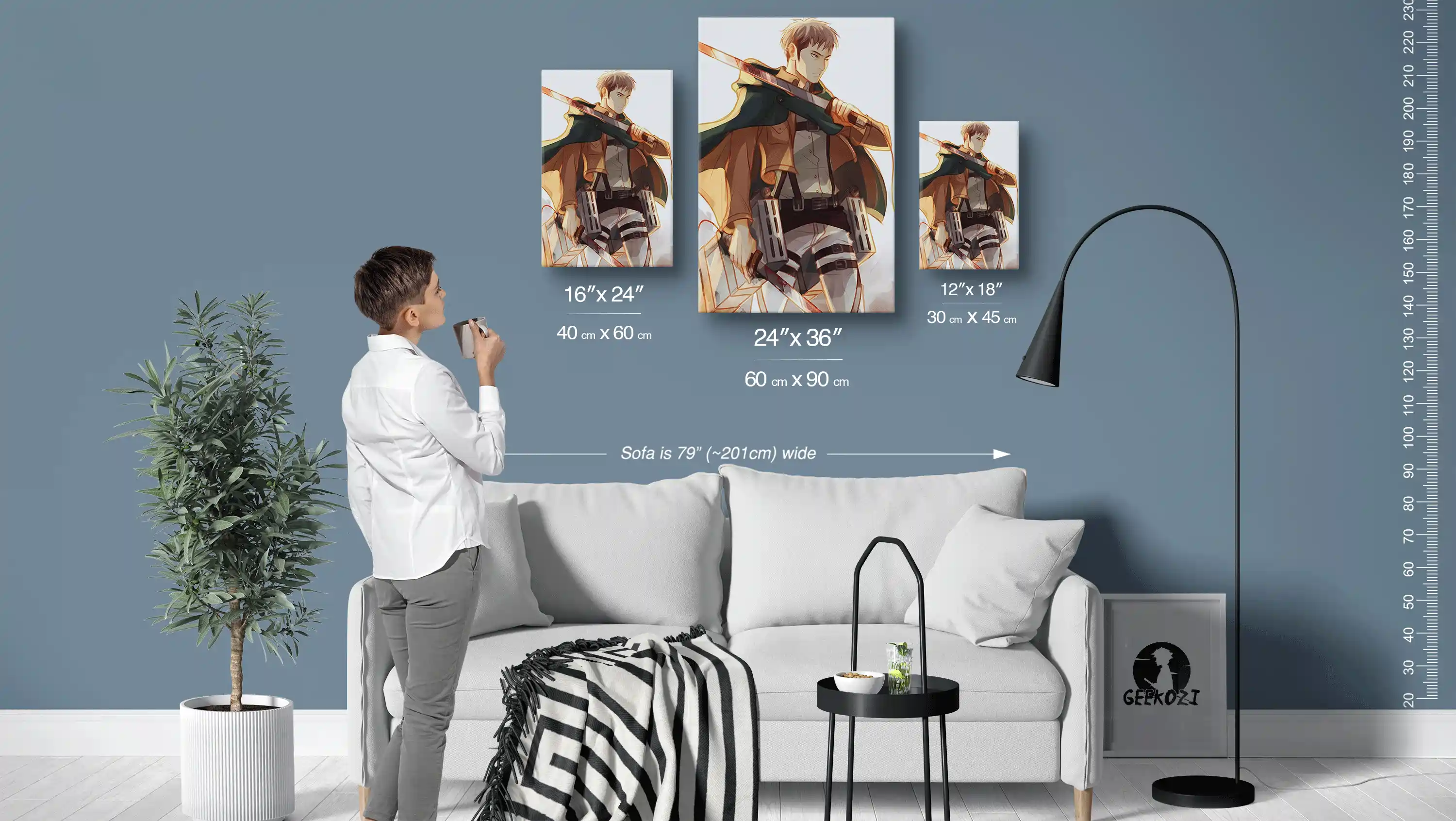 The Somber Anticipation Battle Stance is a striking addition to any space, available in three sizes: 12×18 (30×45 cm), 16×24 (40×60 cm), and 24×36 (60×90 cm). To help you gauge the scale, the sofa in the image above is 79 inches (approximately 201 cm) wide. For smaller areas like desks or cozy nooks, the 12×18 size works beautifully, while the 24×36 option stands out as a bold statement piece for larger feature walls. Choose the size that best fits your space to create an impressive focal point in your home.