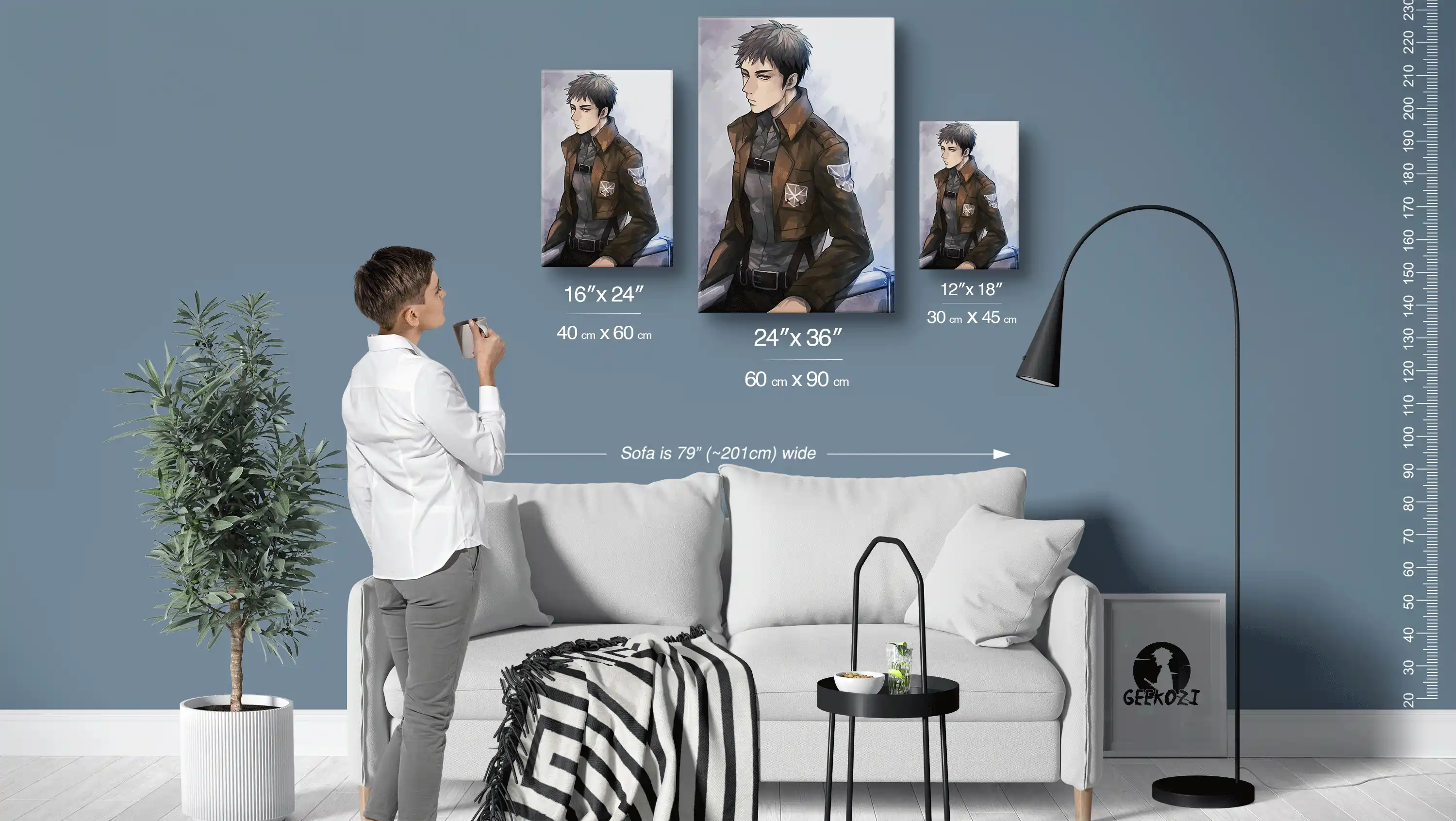 Introducing our striking Somber Battle Contemplation, available in three panel sizes: 12×18 (30×45 cm), 16×24 (40×60 cm), and 24×36 (60×90 cm). To help you visualize its impact, note that the sofa in the image above is 79 inches (approximately 201 cm) wide. If you’re looking to decorate a smaller space like a desk or bedside table, the smallest size is ideal, whereas the largest size makes a bold statement on a feature wall. Choosing the right size can elevate your space and reflect your love for anime in a unique way.