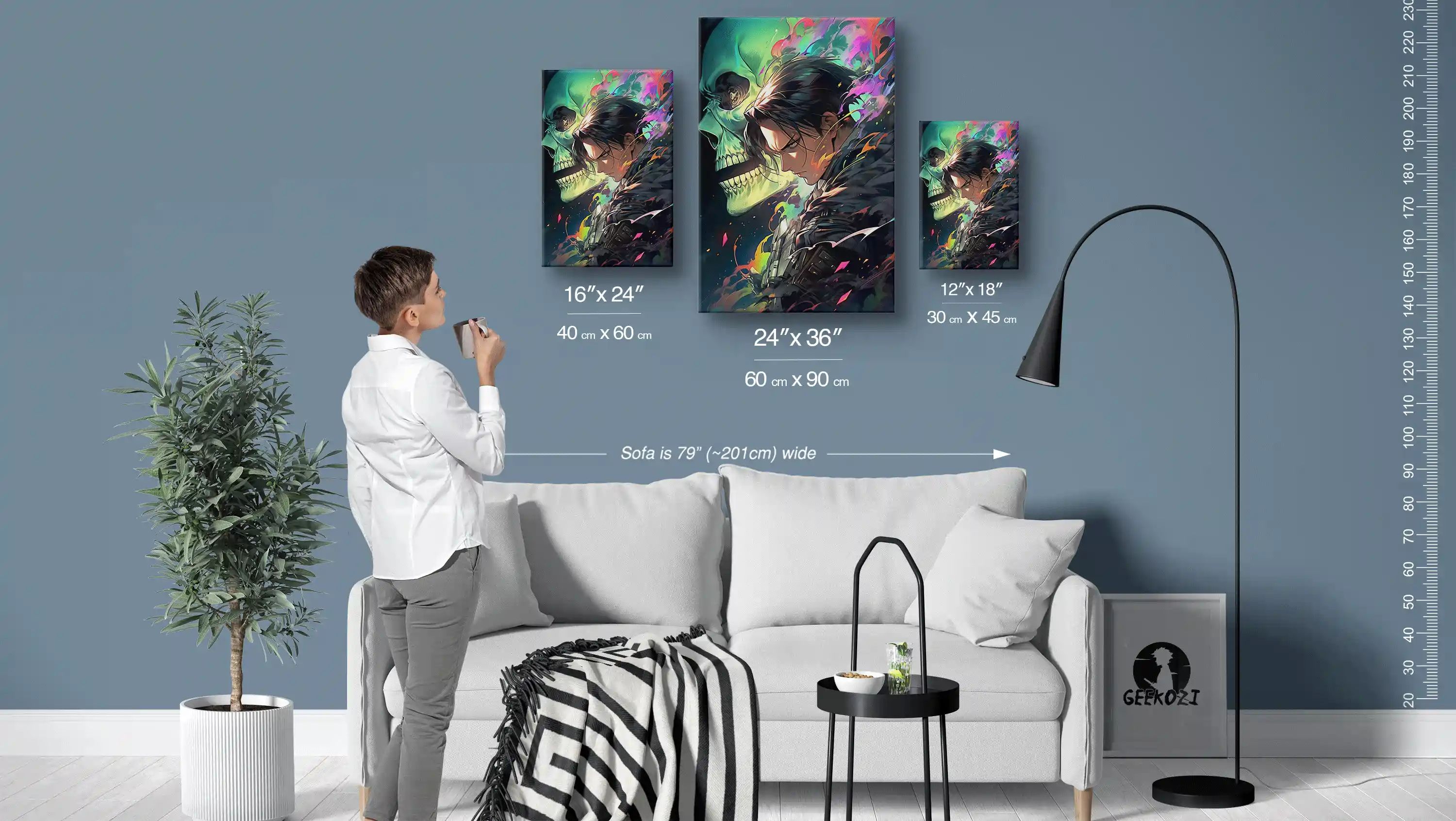 The Eerie Battle Stance wall art is available in three panel sizes: 12×18 (30×45 cm), 16×24 (40×60 cm), and 24×36 (60×90 cm). For reference, the sofa in the image above measures 79 inches (approximately 201 cm) wide, helping you visualize how this striking piece will fit in your space. If you’re looking to enhance a desk or smaller area, the smallest size works perfectly, while the largest size makes a bold statement on feature walls, creating an eye-catching focal point. Choose the size that best complements your space and style.