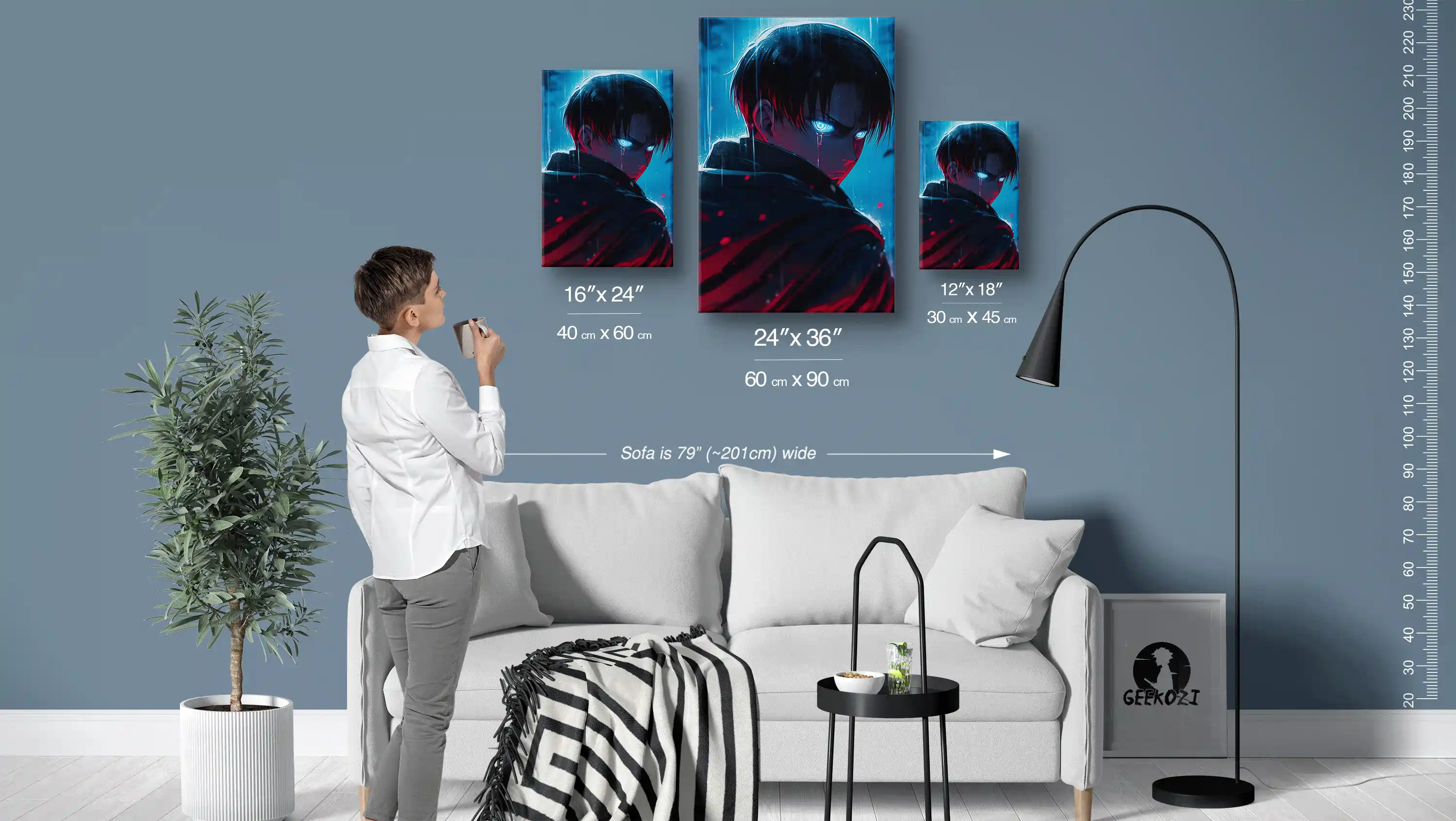 The Ethereal Blue Battle Gaze brings a striking focal point to your space, available in three sizes: 12×18 (30×45 cm), 16×24 (40×60 cm), and 24×36 (60×90 cm). The sofa in the image above measures 79 inches (approximately 201 cm) wide, which can help you gauge the right size for your home. If you’re looking to decorate a small desk or corner, the smallest size will fit perfectly. For a dramatic statement on a feature wall, consider opting for the largest size to create an impressive visual impact.
