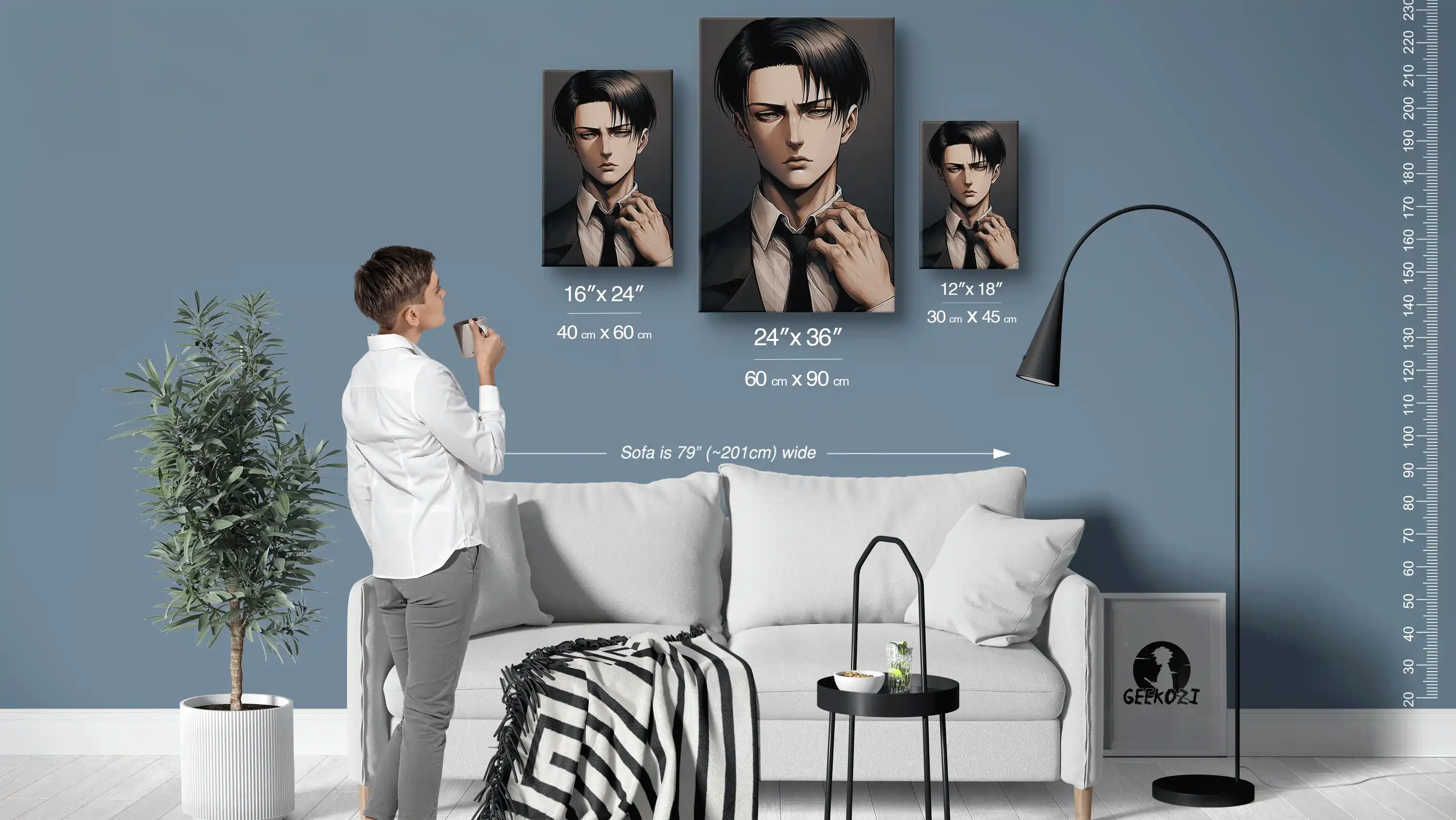 Dark hues intermingle with stark contrasts in this alluring portrayal of Levi Ackerman from Attack on Titan. The art uses a restricted color palette dominated by deep grays and blacks, punctuated by the pale light of Levi’s skin. This selective illumination casts dramatic shadows across his face, highlighting his intense gaze and the subtle furrow of his brow. The perspective is intimately close, putting focus on Levi’s expression and the delicate texture of his garments. The overall mood is somber and thoughtful, with a touch of enigma woven through the meticulous strokes and shading.Levi Ackerman stands poised in a moment of quiet introspection, his hand subtly adjusting his tie which serves as a direct nod to his meticulous nature revealed in the Courtroom Scene episode. This pose captures the resigned determination that defines Levi, resonating deeply with fans who admire his tactical acumen and unwavering resolve. The character’s intensity and the stoic silence of the scene stir a profound emotional response, reminiscent of the dark and thrilling atmosphere of his battles. It’s a moment that encapsulates Levi’s complex character, leader, soldier, and survivor.Ideal for hanging in a home office or personal library, this piece invites contemplation and reverence, epitomizing the spirit of one of anime’s most compelling heroes.