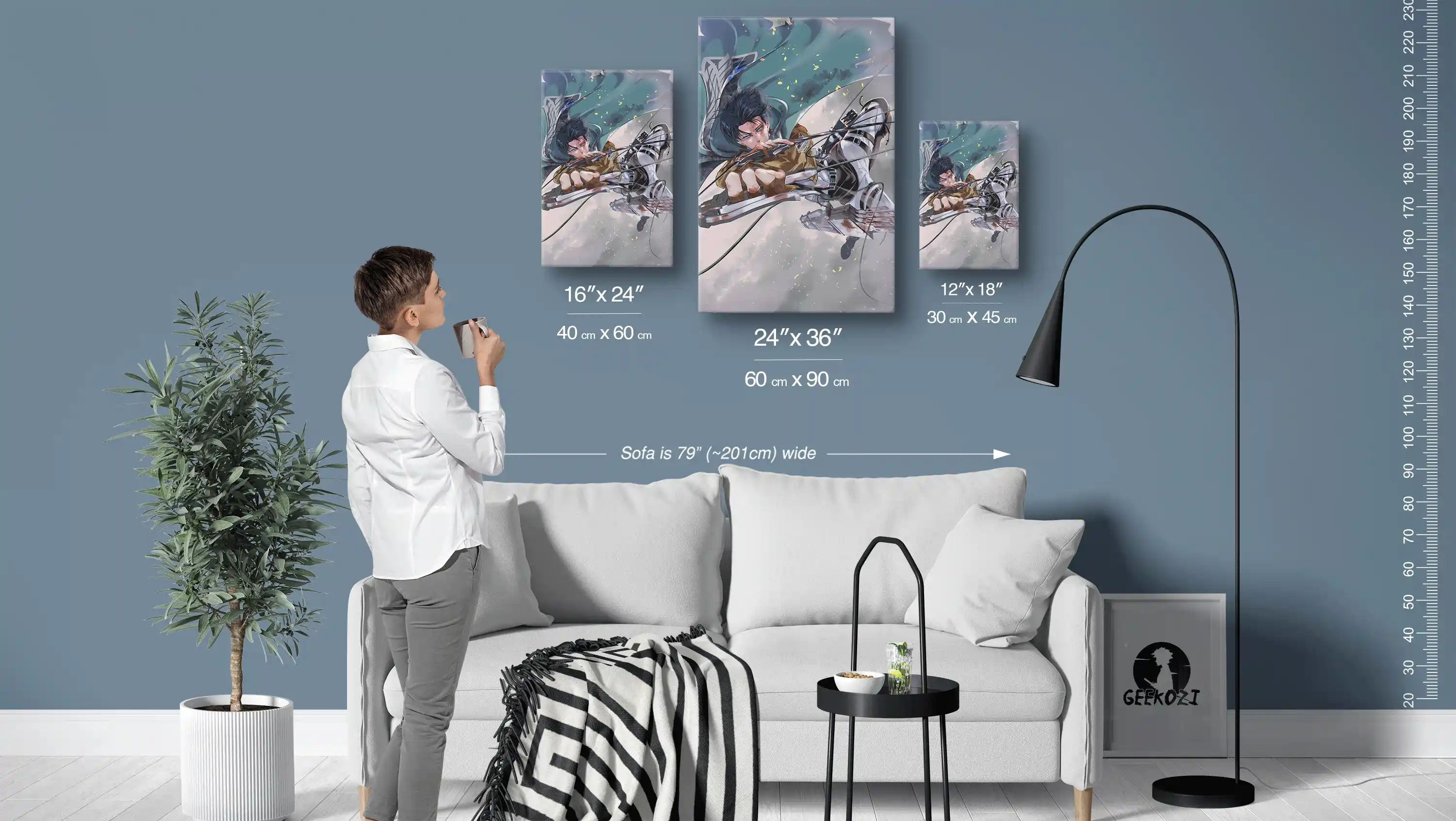 The Turbulent Airborne Blade adds a striking element to your space, available in three panel sizes: 12×18 (30×45 cm), 16×24 (40×60 cm), and 24×36 (60×90 cm). To give you an idea of scale, the sofa in the image above is 79 inches (≈201 cm) wide. For smaller areas like desks or personal nooks, the 12×18 option works wonders, while the 24×36 size is perfect for making a statement on feature walls. Choose the right size to fit your space and let the art do the talking.