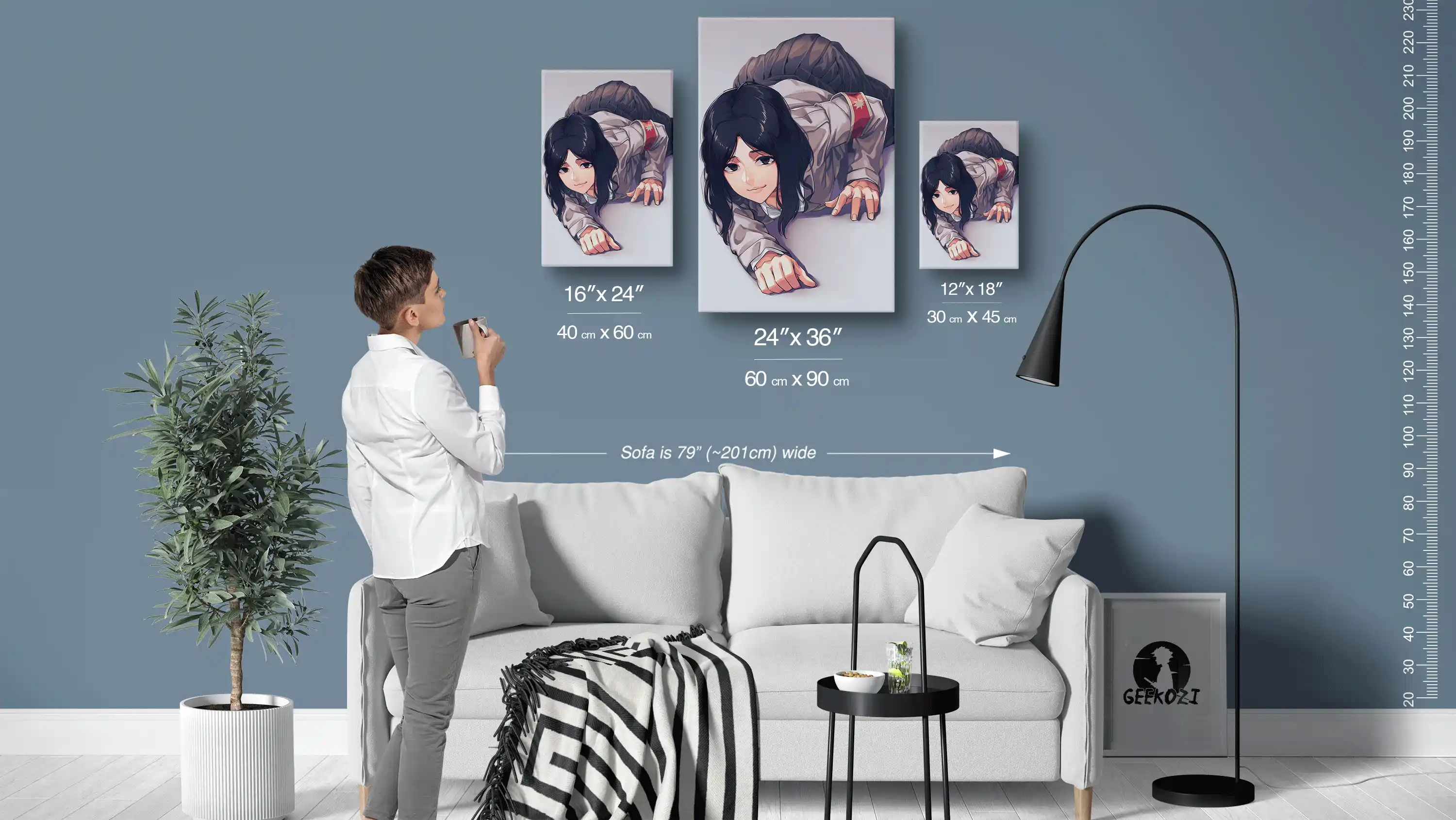 The Serene Violet Aura Low Angle is available in three panel sizes: 12×18 (30×45 cm), 16×24 (40×60 cm), and 24×36 (60×90 cm). To help you visualize its placement, the sofa in the image above is 79 inches (≈201 cm) wide. When choosing the right size, consider using the smallest option for desks and the largest for feature walls, creating a striking focal point in your space. This piece blends beautifully with various interiors, enhancing the atmosphere while showcasing your love for anime.