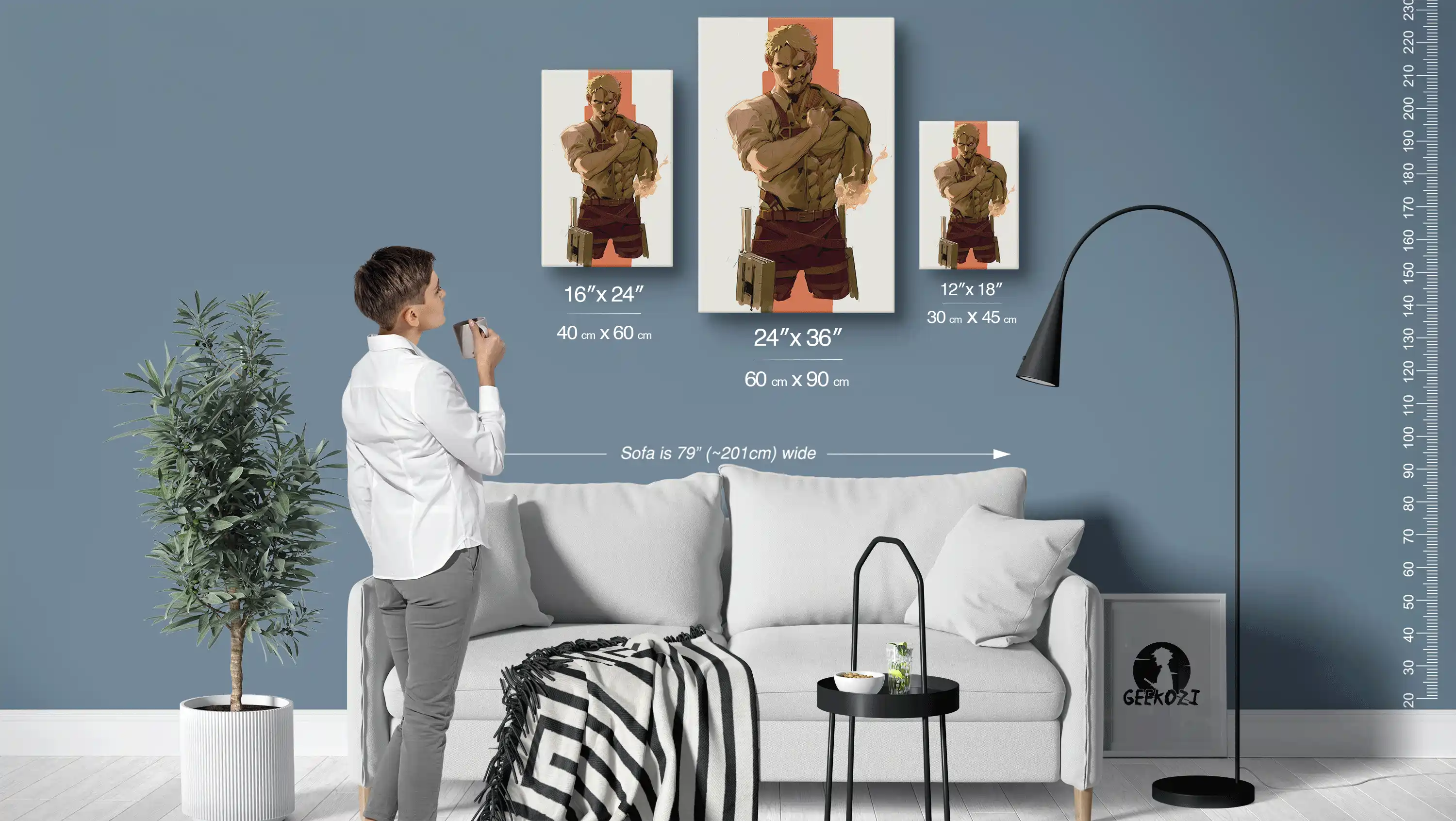 The Gritty Fist of Anticipation offers a striking visual impact in three panel sizes: 12×18 (30×45 cm), 16×24 (40×60 cm), and 24×36 (60×90 cm). To help you visualize its presence, keep in mind that the sofa in the image above measures 79 inches (approximately 201 cm) wide. For smaller spaces like desks, the 12×18 option works best, while the 24×36 size makes a stunning statement for feature walls. Choose the size that fits your space and expresses your passion for anime art.