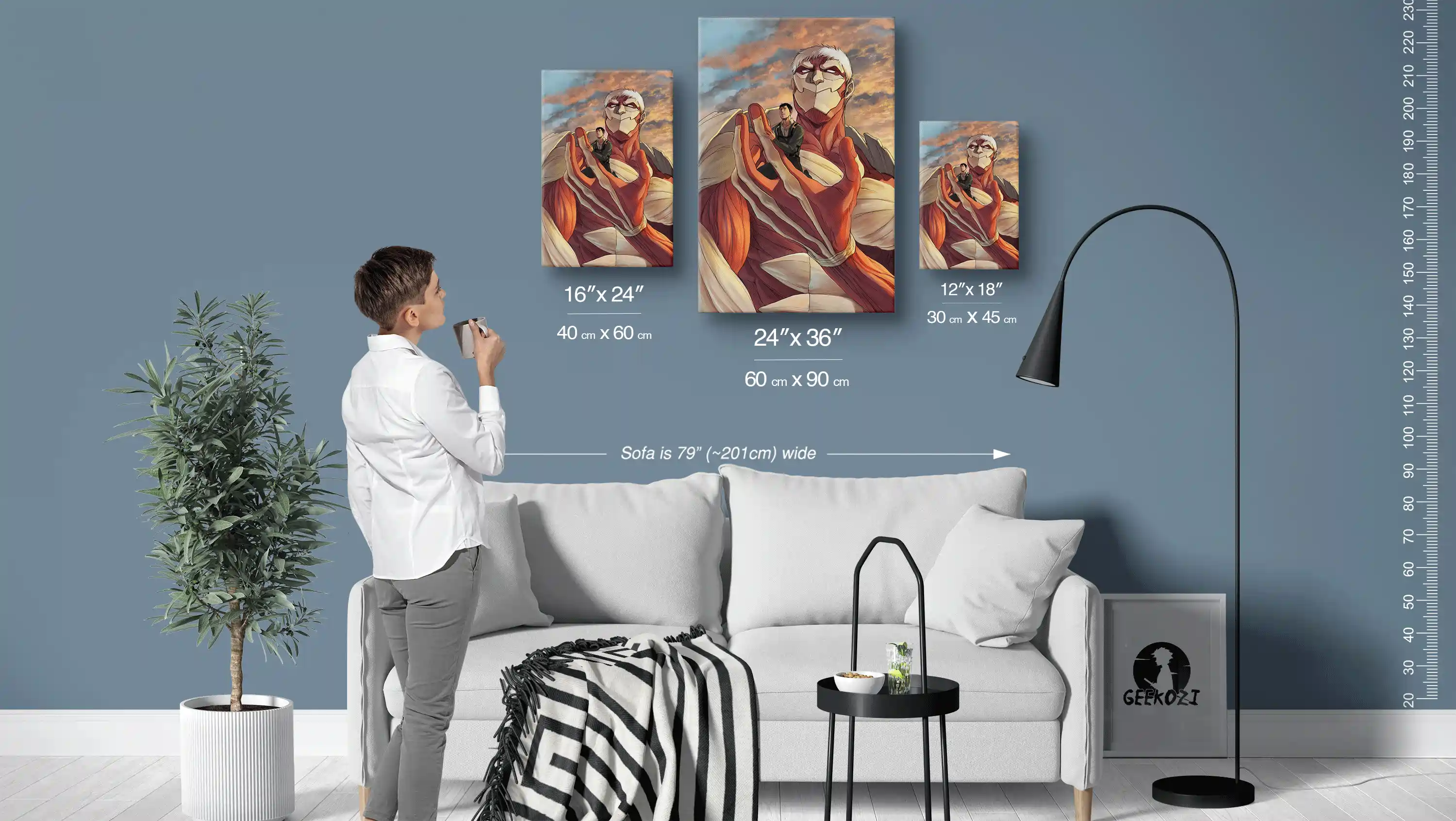 Transform your space with the Somber Titan Standoff, available in three striking panel sizes: 12×18 (30×45 cm), 16×24 (40×60 cm), and 24×36 (60×90 cm). The featured sofa in the image above measures 79 inches (approximately 201 cm) wide, giving you a sense of scale for your selection. Consider using the smallest size for desks or smaller areas, while the largest panel works beautifully as a focal point on a feature wall, making a bold statement in your home. With its captivating design, the Somber Titan Standoff is sure to add a unique touch to your decor.