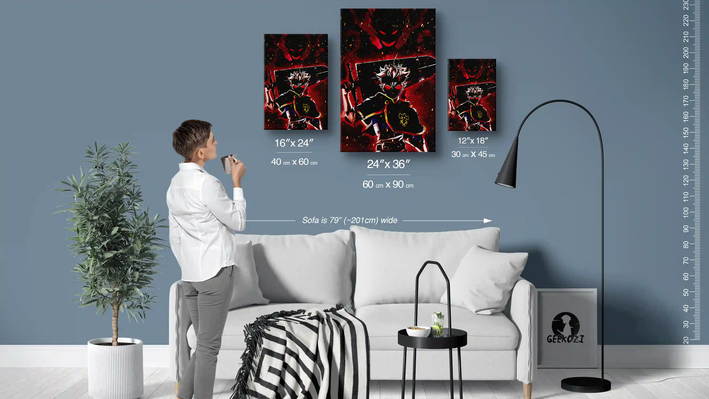 Elevate your space with the striking Crimson Clash Sword Strike, available in three captivating panel sizes: 12×18 (30×45 cm), 16×24 (40×60 cm), and 24×36 (60×90 cm). To help you judge scale, the sofa in the image above measures 79 inches (approximately 201 cm) wide. When choosing the right size for your home, consider using the smallest size for a desk or cozy nook, while the largest option works wonderfully as a center piece on a feature wall. Whichever size you choose, this artwork promises to bring a bold statement to your surroundings.