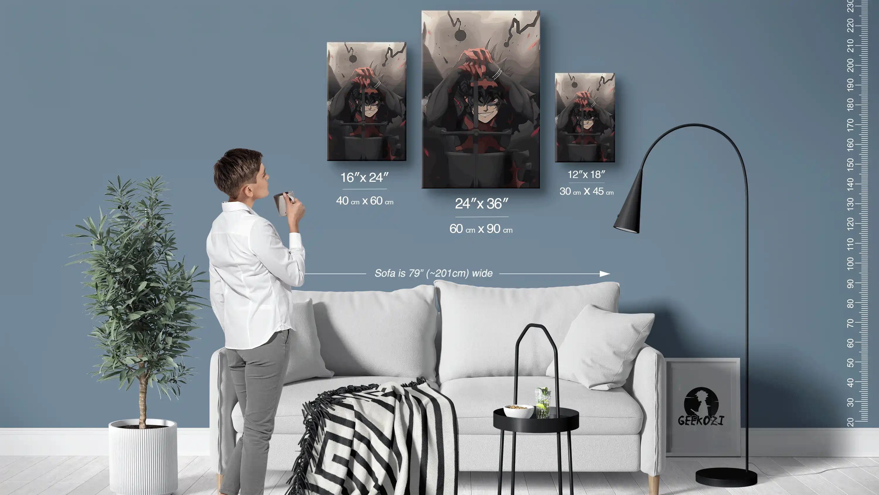 The Dramatic Anti Magic Sword is available in three panel sizes: 12×18 (30×45 cm), 16×24 (40×60 cm), and 24×36 (60×90 cm), making it easy to find the perfect fit for your space. To help you visualize the scale, the sofa in the image above measures 79 inches (approximately 201 cm) wide. If you want to brighten up a smaller area like a desk, the 12×18 size works nicely. For those looking to make a statement on a feature wall, the 24×36 option is ideal. Choose the size that suits your style and space best.
