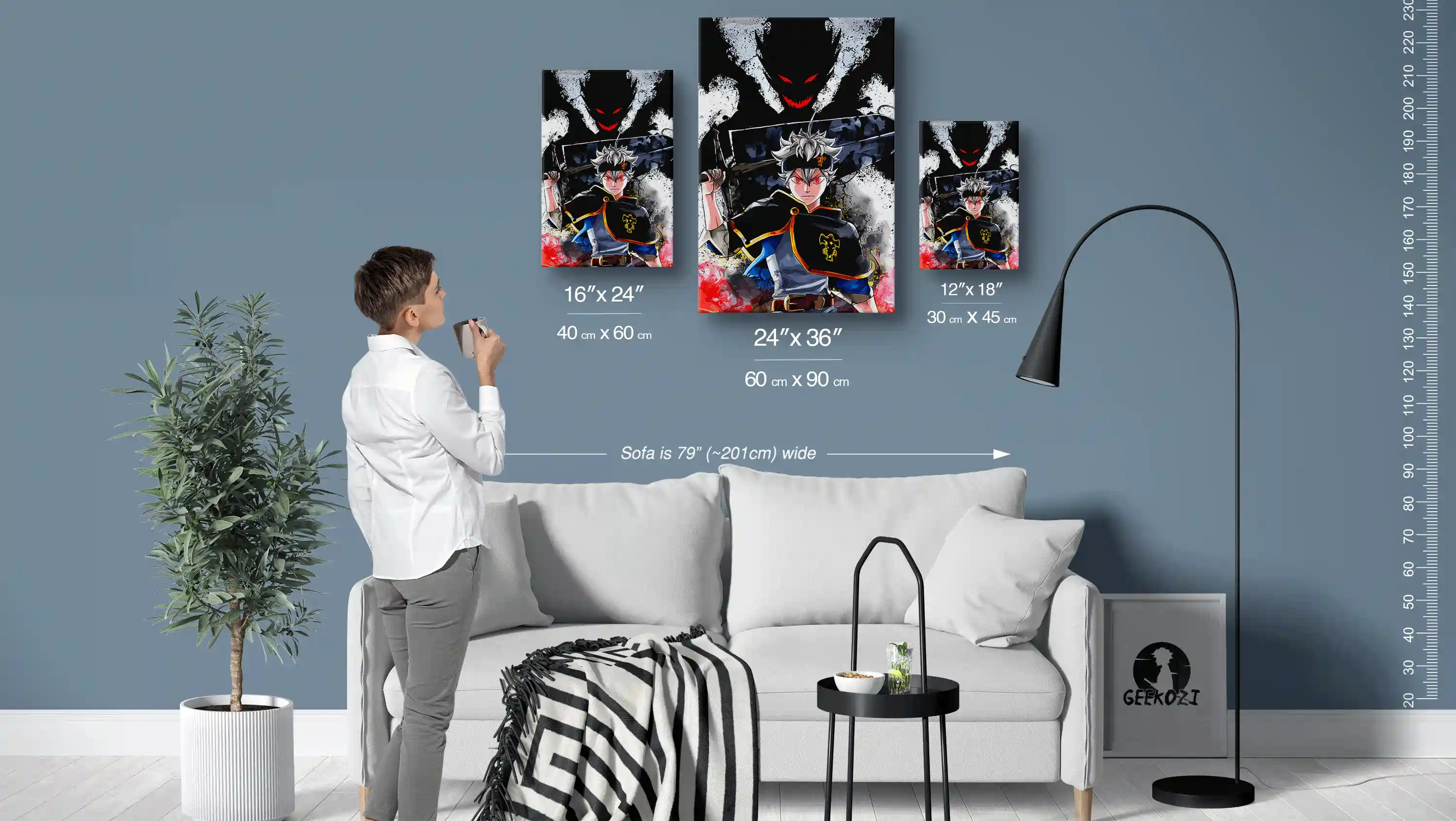 Transform your space with the Dramatic Sword Clash, a stunning piece of anime metal wall art available in three sizes: 12×18 (30×45 cm), 16×24 (40×60 cm), and 24×36 (60×90 cm). The sofa in the image above measures 79 inches (approximately 201 cm) wide, providing a helpful reference for scale. When selecting a size, consider the largest option for a striking feature wall while the smallest works perfectly for desks or smaller areas. Choose the size that fits best with your existing decor and enjoy the captivating energy this artwork brings to your home.