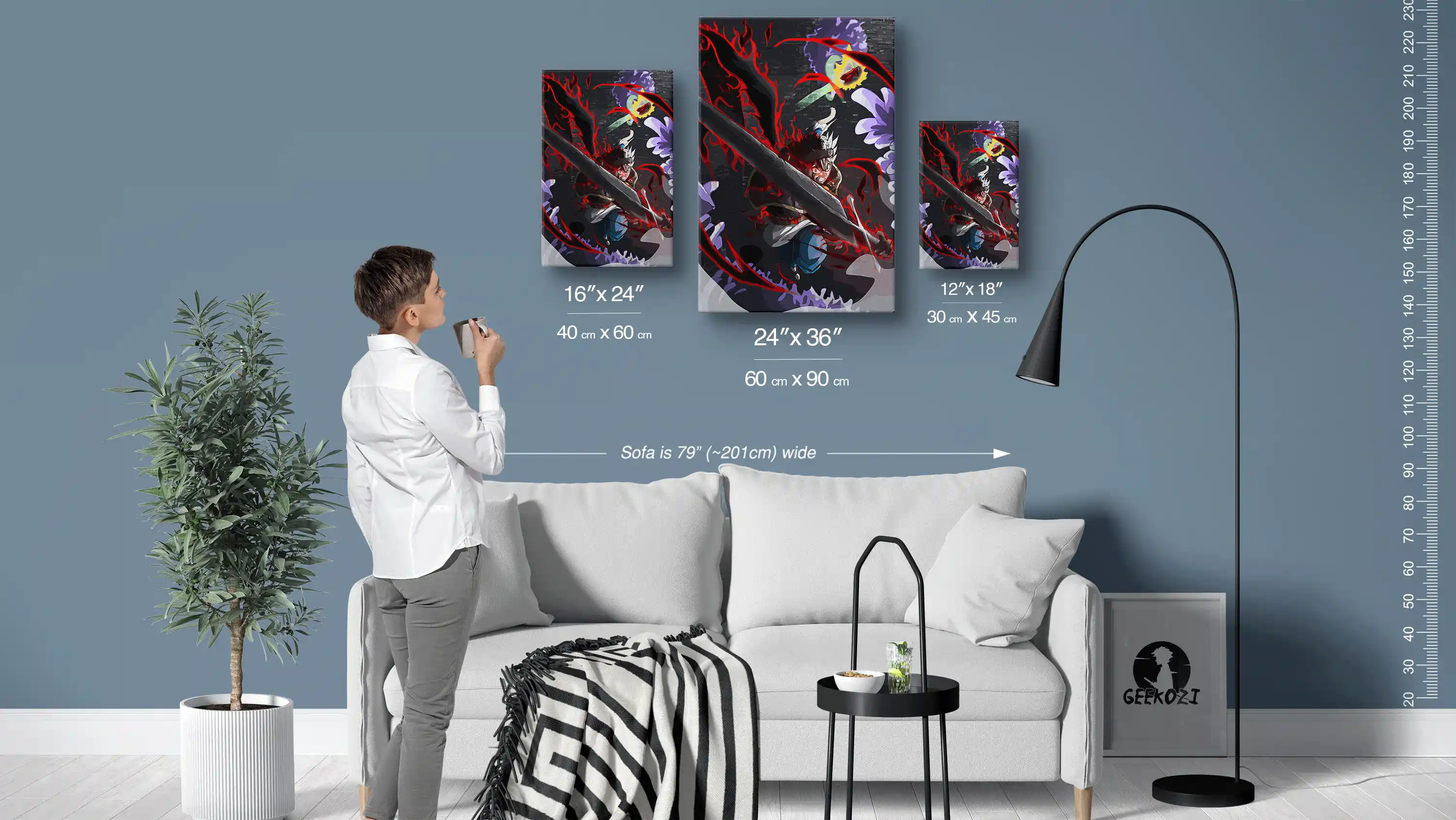 Transform your space with the dramatic Menacing Energy Sword Clash, available in three stunning panel sizes: 12×18 (30×45 cm), 16×24 (40×60 cm), and 24×36 (60×90 cm). For scale reference, the sofa in the image above measures 79 inches (approximately 201 cm) wide. When deciding on the size, consider using the smallest option for desk displays to add character or the largest size to create a striking feature wall that draws attention. Each piece is crafted to bring dynamic energy into any room, making it a unique addition to your decor.