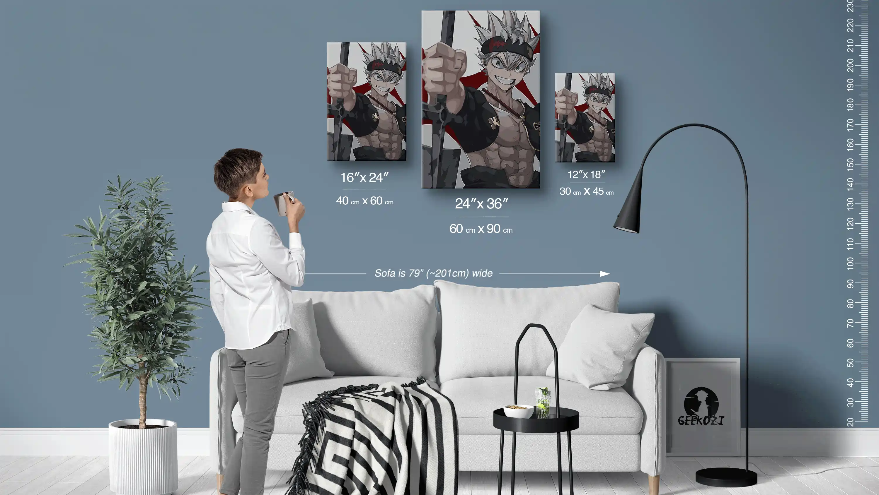 The Striking Grin Amid Cascading Light is available in three panel sizes: 12×18 (30×45 cm), 16×24 (40×60 cm), and 24×36 (60×90 cm). To help you gauge the perfect fit, the sofa in the image above measures 79 inches (approximately 201 cm) wide. For smaller spaces like desks or smaller walls, the 12×18 option works well, while the 24×36 size makes a bold statement on feature walls. Consider the overall space and your personal style when choosing the right size to complement your home.