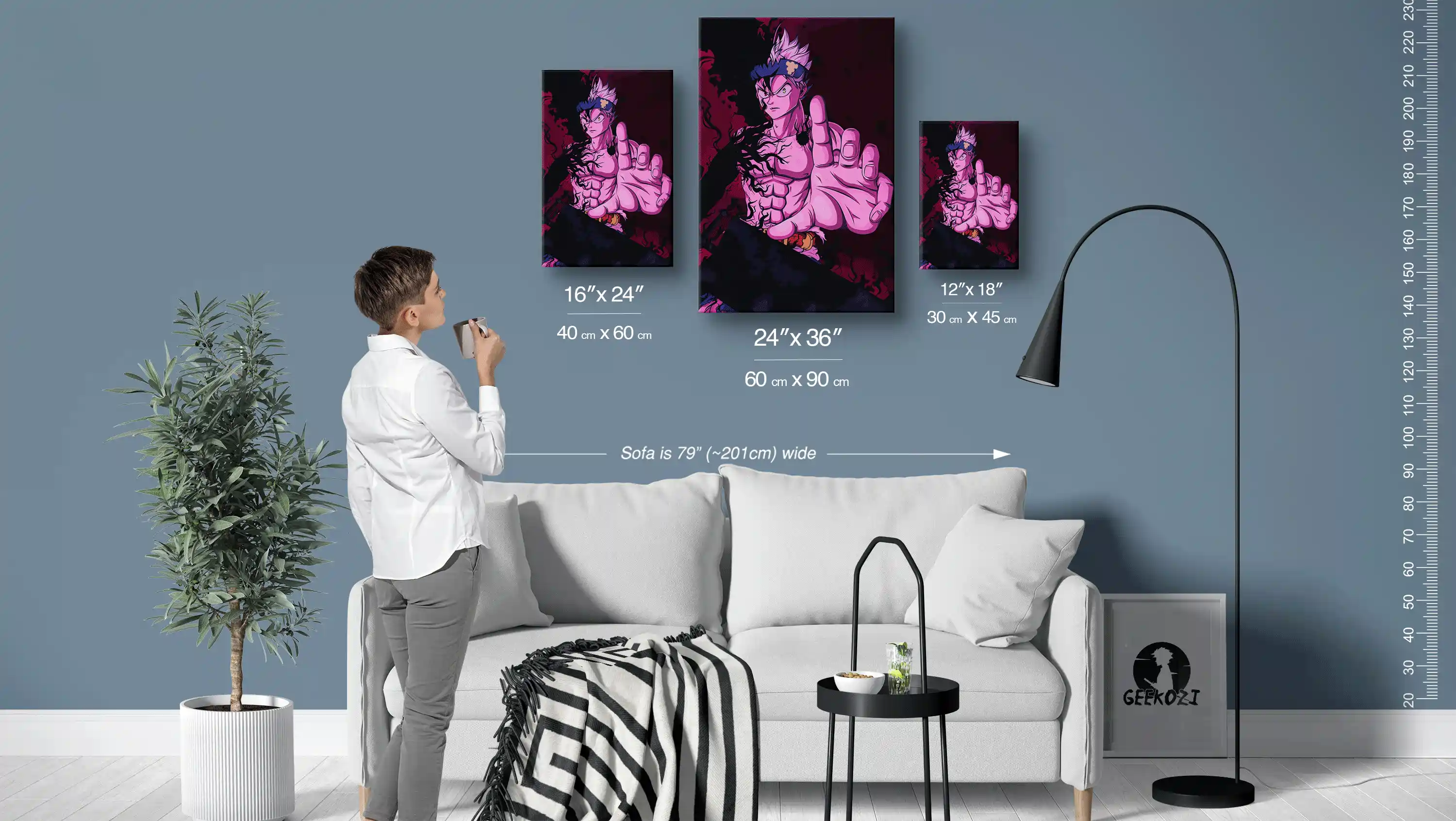 The Tumultuous Outstretched Hand wall art is available in three sizes: 12×18 (30×45 cm), 16×24 (40×60 cm), and 24×36 (60×90 cm). To give you an idea of scale, the sofa in the image above measures 79 inches (approximately 201 cm) wide. For smaller spaces like desks or bedrooms, the 12×18 size is ideal, while the 24×36 size makes a striking impact on feature walls, providing an eye-catching focal point. Choose the size that best complements your space to bring the artistry of anime into your home.