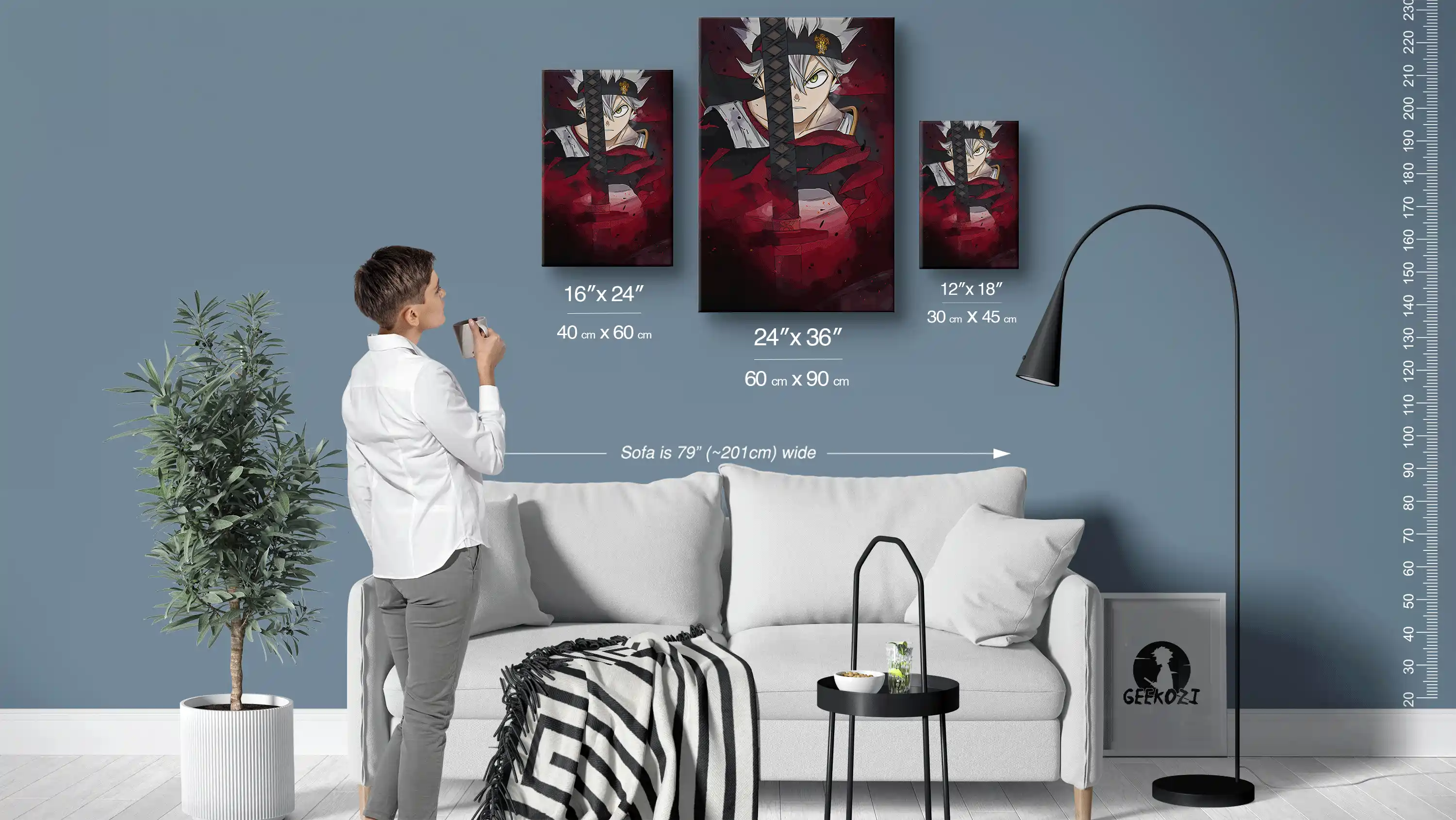 The Visceral Crimson Sword Clash is available in three striking panel sizes: 12×18 (30×45 cm), 16×24 (40×60 cm), and 24×36 (60×90 cm). To help with your decision, the sofa in the image above is 79 inches wide, giving a good sense of scale. For smaller spaces like desks, the 12×18 size is perfect, while the largest 24×36 option creates a stunning focal point for feature walls. Choose a size that best fits your space and adds the right impact to your decor.