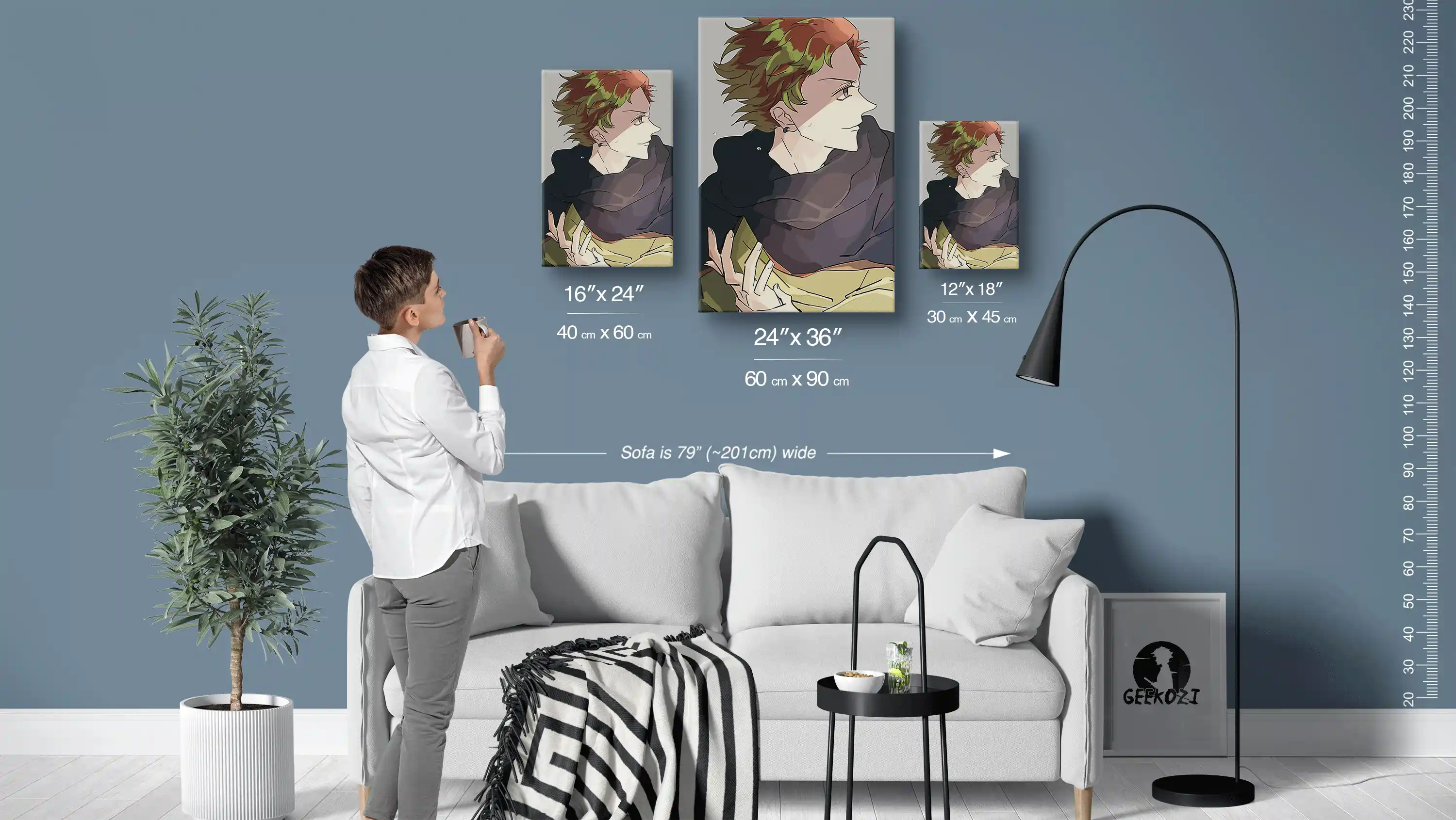 Introspective Gaze with Magic Tome comes in three panel sizes: 12×18 (30×45 cm), 16×24 (40×60 cm), and 24×36 (60×90 cm), allowing you to find the perfect fit for your space. The sofa in the image above is 79 inches (≈201 cm) wide, providing a reference point for how these sizes might look in your home. A simple tip for choosing the right size is to consider using the smallest option for desks or tight spaces while the largest can create a stunning focal point on feature walls. Whether you want a subtle addition or a striking centerpiece, there’s an ideal size for every setting.