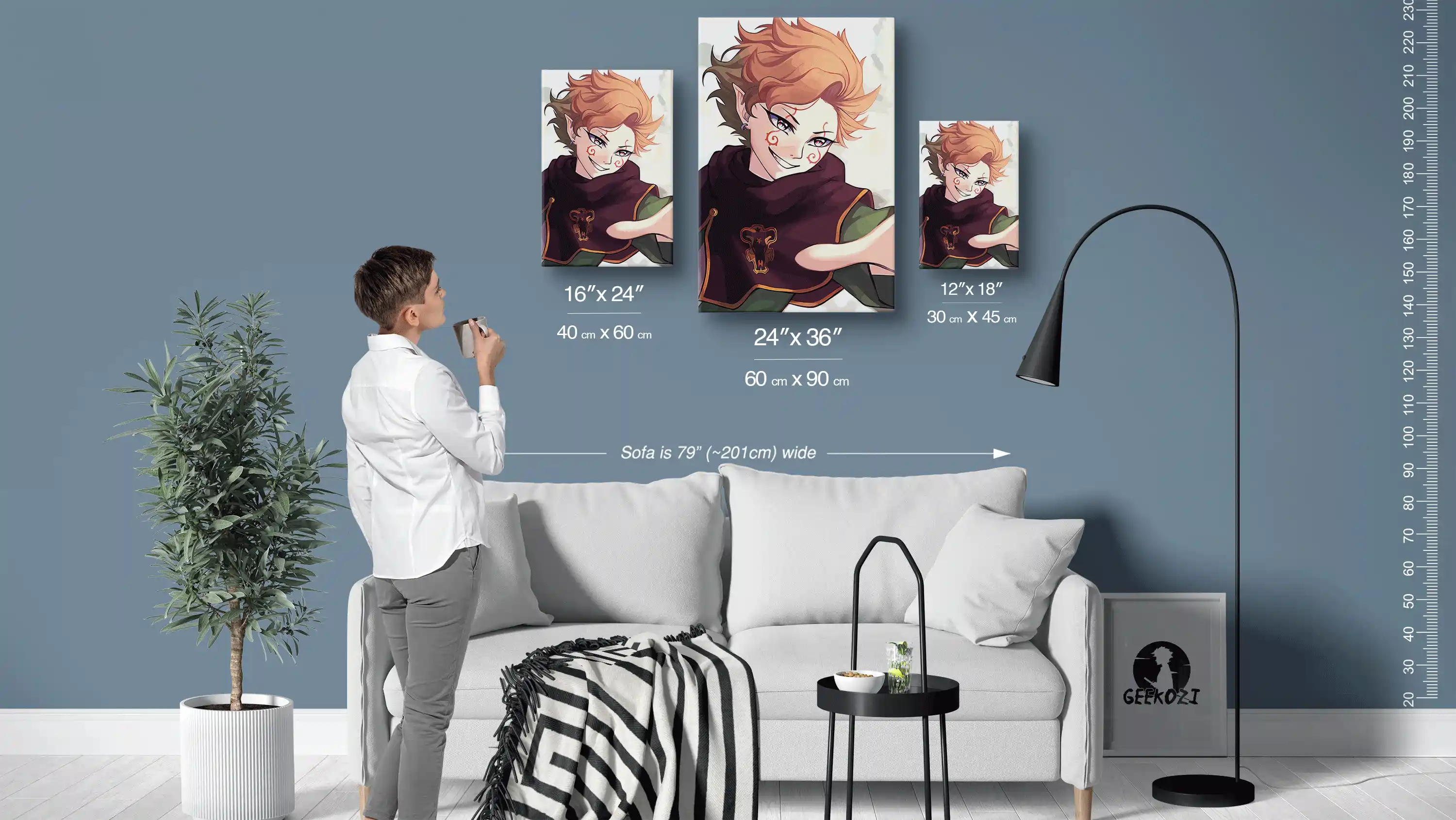 Introducing the Mysterious Wind Swept Grin, a stunning piece of anime metal wall art that will elevate any space. Available in three sizes: 12 inches by 18 inches, 16 inches by 24 inches, and 24 inches by 36 inches, this art comes in a variety that can fit different preferences. The sofa in the image above measures 79 inches wide, which can help you visualize how each size will look in your home. A simple tip for choosing the right size is to place the smallest piece over a desk or small space, while the largest size works beautifully as a centerpiece on a feature wall.