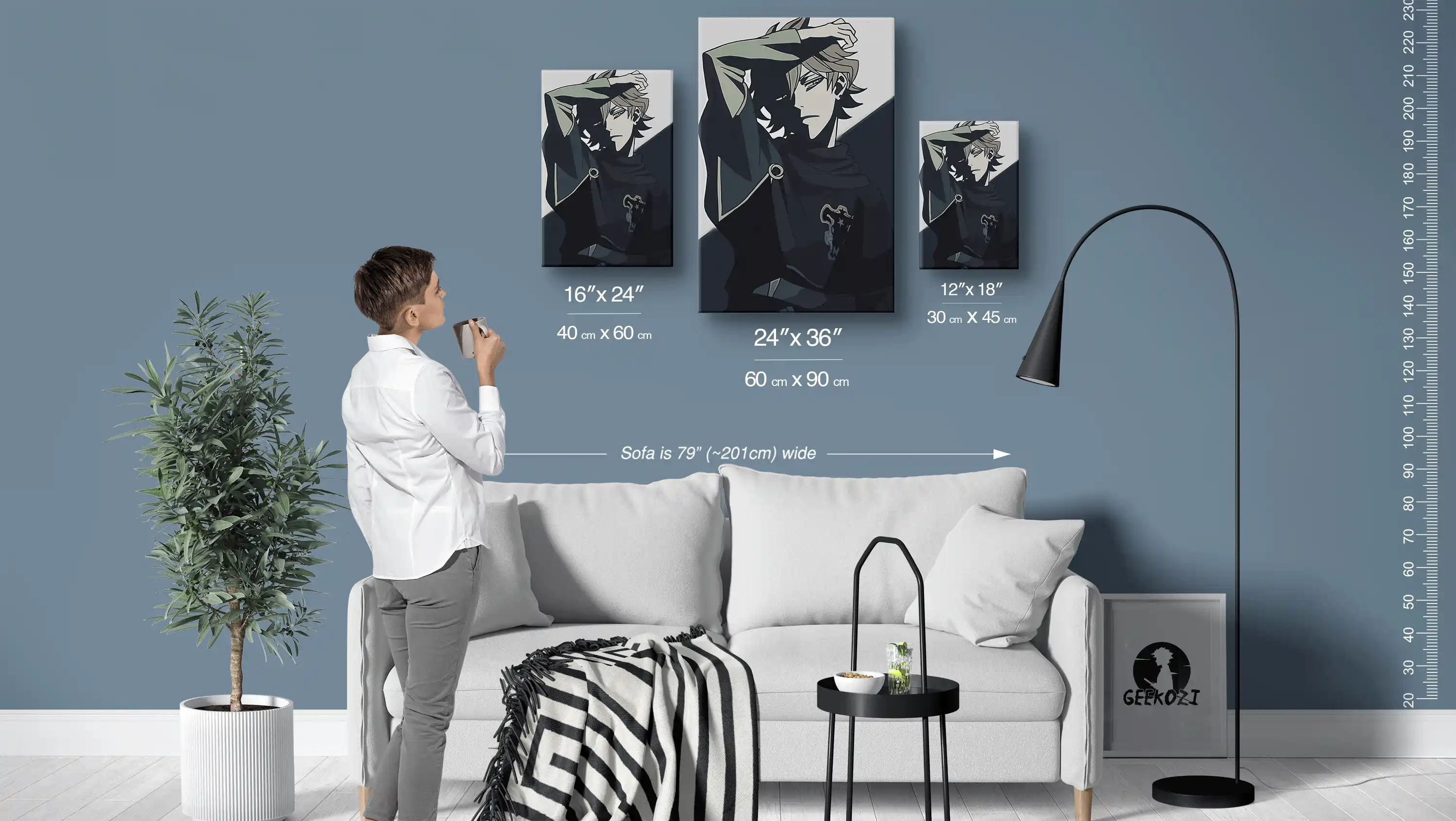 The Reflective Pause with Thoughtful Gaze is available in three striking panel sizes: 12×18 (30×45 cm), 16×24 (40×60 cm), and 24×36 (60×90 cm). To help you visualize its presence, keep in mind that the sofa in the image above is 79 inches (approximately 201 cm) wide. A simple tip for choosing the right size is to consider where you’ll place it; the smallest size works well for desks, while the largest size can create a stunning focal point on feature walls. Choose the perfect size to match your space and elevate your home decor with this captivating piece.