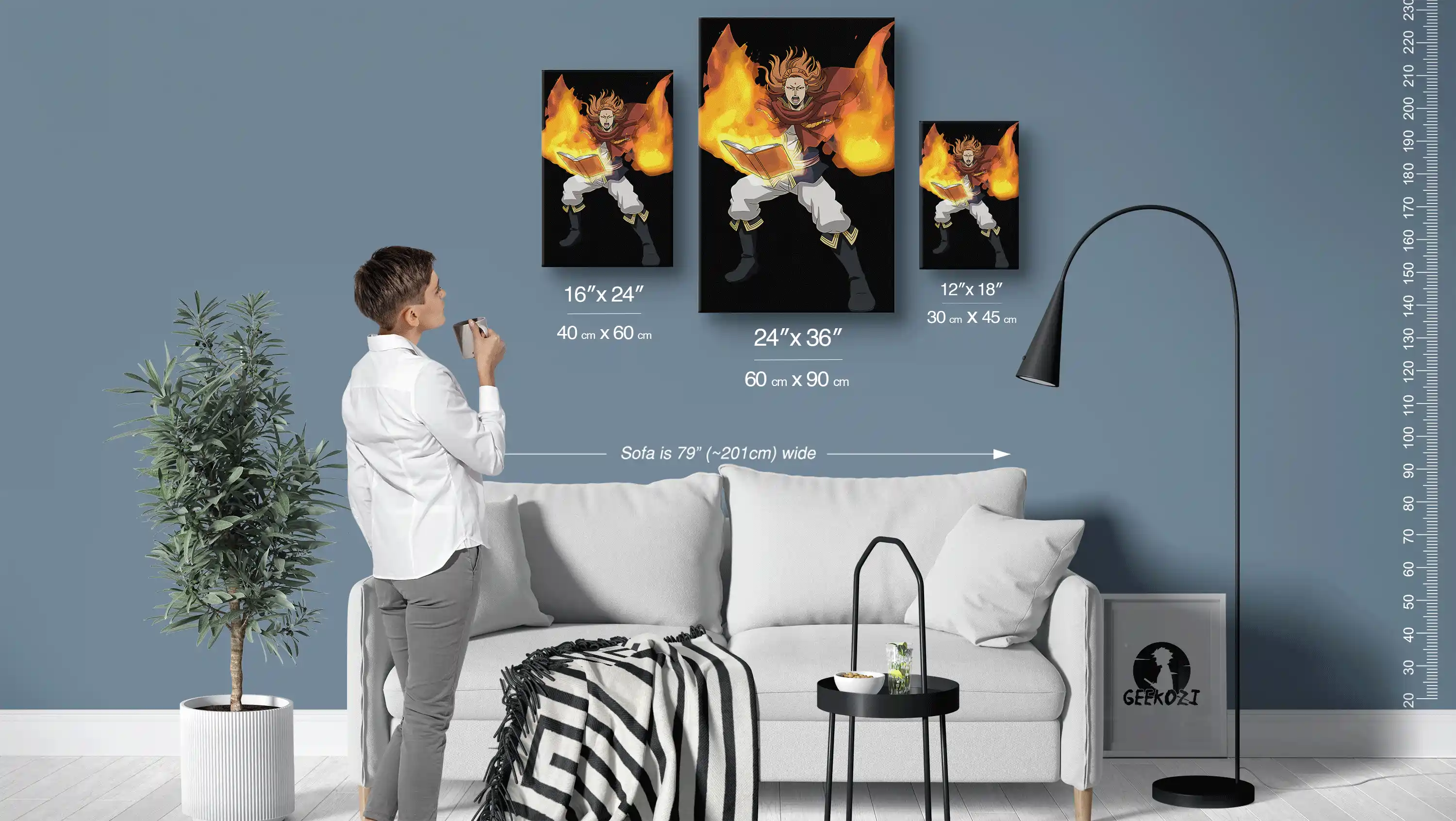 Bathed in the fierce hues of roaring flames, the depiction of Fuegoleon Vermillion captures a dramatic moment full of power and intensity. The composition highlights the bold interplay of fire-like oranges and deep blacks, creating a striking contrast that draws the eye to the central figure. Illuminated from below, Fuegoleon’s fierce expression and dynamic posture are accentuated by dramatic shadows that emphasize the texture of his flowing cape and fiery backdrop. The perspective, angled upward, adds a heroic feel, enveloping the viewer in the scene’s epic mood.In this dynamic portrayal, Fuegoleon stands with his grimoire open, summoning his signature move, Salamander’s Breath, a moment fans might recall from the intense battles of the Witches’ Forest arc. His commanding pose and the strategic use of his fiery magic highlight his role as a formidable captain in the Black Clover series. The artwork evokes a sense of fierce determination and resilience, resonating deeply with fans who admire Fuegoleon’s leadership and strength in overcoming adversaries.Ideal for enhancing a themed media room or a dedicated fan’s collection shelf.