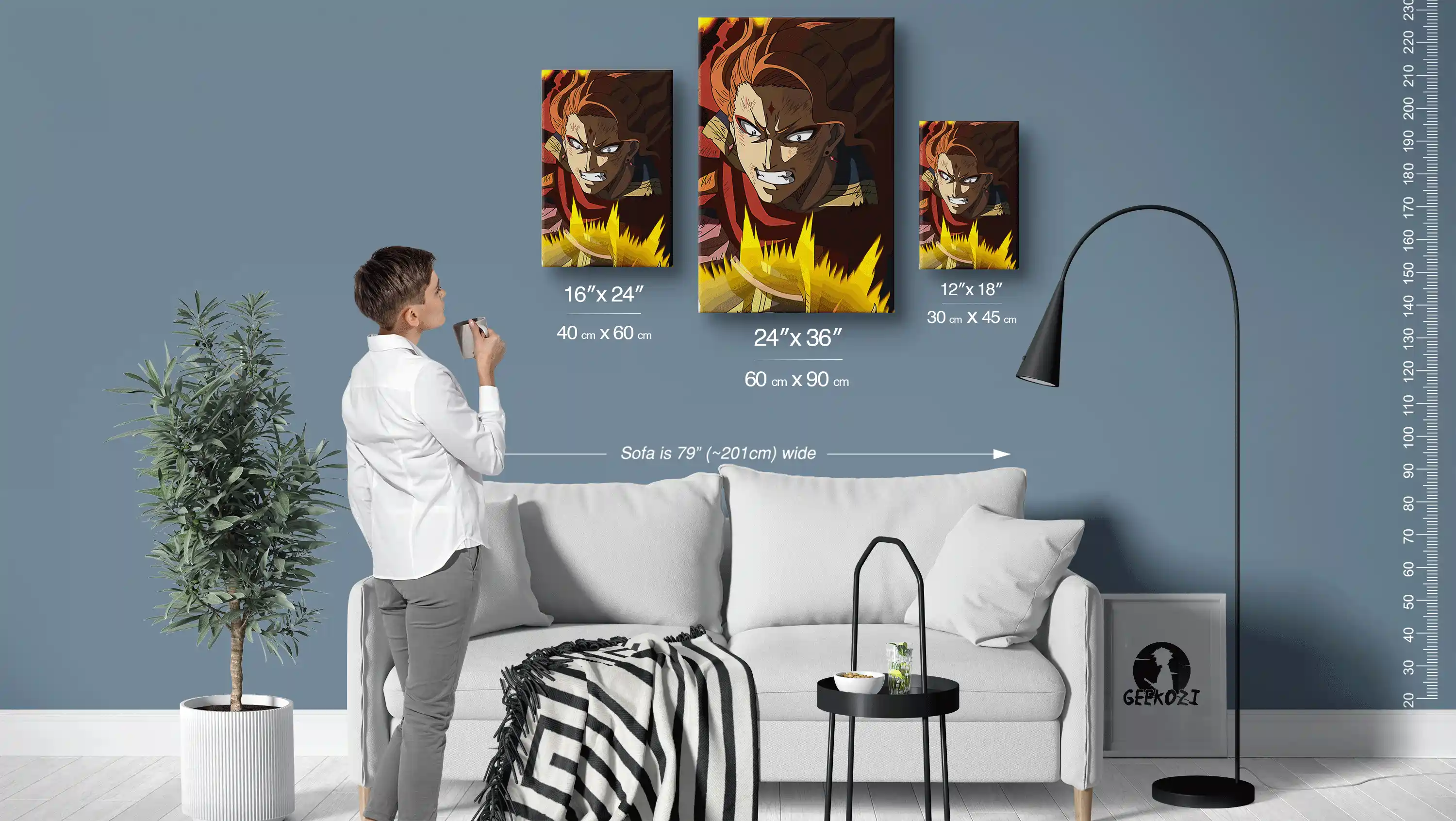 Bathed in fiery hues, the composition of Fuegoleon Vermillion ignites passion and intensity. The perspective is masterfully crafted, emphasizing his commanding presence through an upward angle, enveloping viewers in a sense of awe. The color palette bursts with varying shades of red and orange, mirroring the scorching heat of flames, while the touches of dark shadows inject a dramatic contrast. Every texture seems palpable, from the soft wisps of his hair to the rugged contours of his armor, conveying a sense of realism and depth. The lighting direction from below projects an almost divine aura onto Fuegoleon, enhancing the overall majestic and powerful mood of the scene.Captured in a moment of fierce determination, Fuegoleon Vermillion stands enveloped in his signature Salamander’s Breath, a spectacle of power that fans of Black Clover admire deeply. This striking pose is a direct nod to the intense battles during the Eye of the Midnight Sun arc, reflecting his role as a formidable captain with unparalleled fire magic. The artwork evokes a profound emotion of resilience and leadership, making it resonate with fans who follow his journey of bravery and strategic mastery during critical confrontations. Each element of this visual tribute stirs a stirring sense of admiration and nostalgia for Fuegoleon’s character and his moments of triumph.Ideal for spotlighting the center of a living room or as a captivating centerpiece in a dedicated anime viewing space.