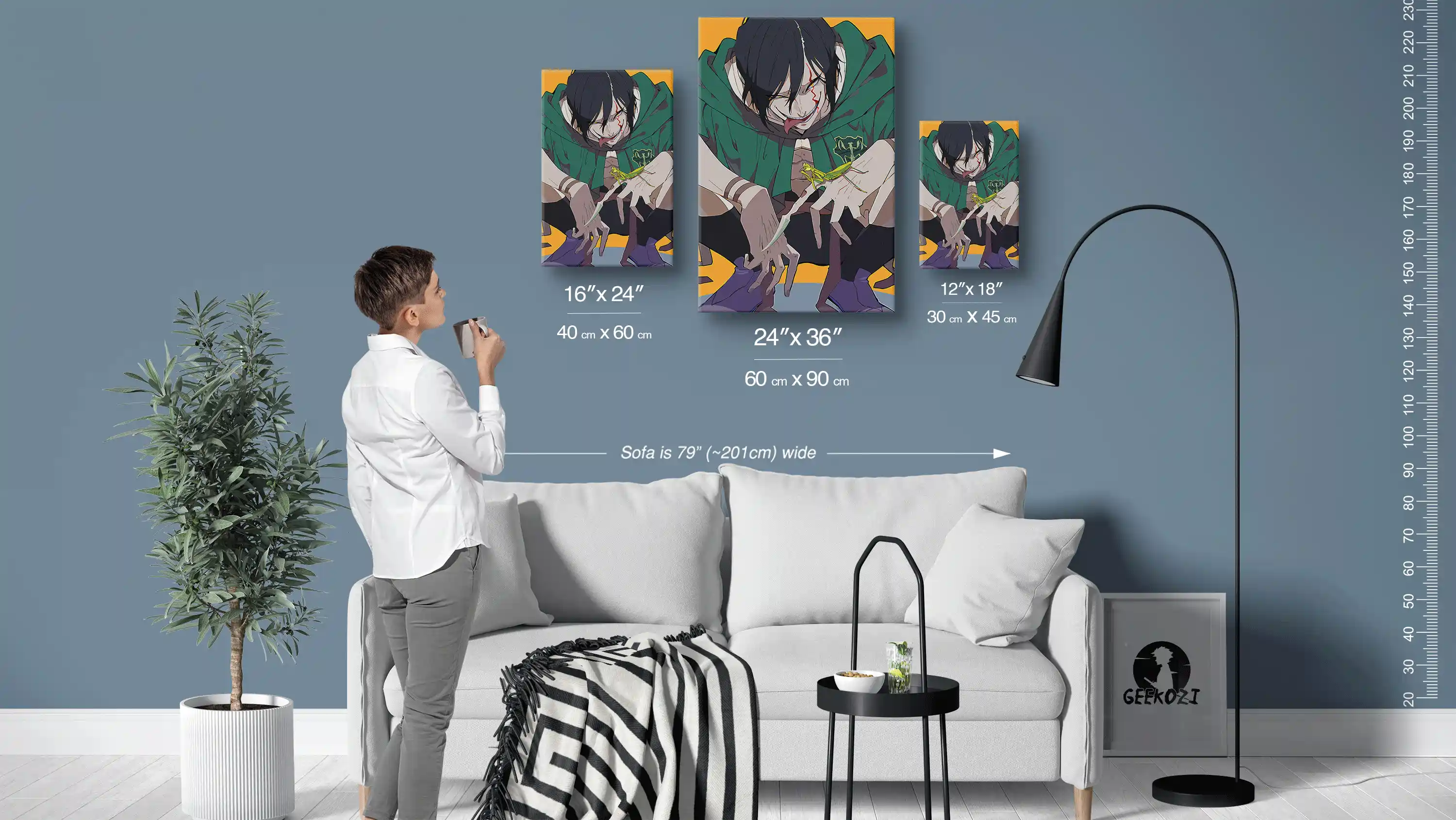 The Foreboding Blades Up Close brings striking anime art to your living space, available in three panel sizes: 12×18 (30×45 cm), 16×24 (40×60 cm), and 24×36 (60×90 cm). To help gauge the size, the sofa in the image above measures approximately 79 inches (201 cm) wide. For a cozy desk setup, the smallest size works perfectly, while the largest panel is ideal for making a dramatic statement on feature walls. Choose the size that best fits your space and personal style, ensuring this stunning piece fits seamlessly into your home.