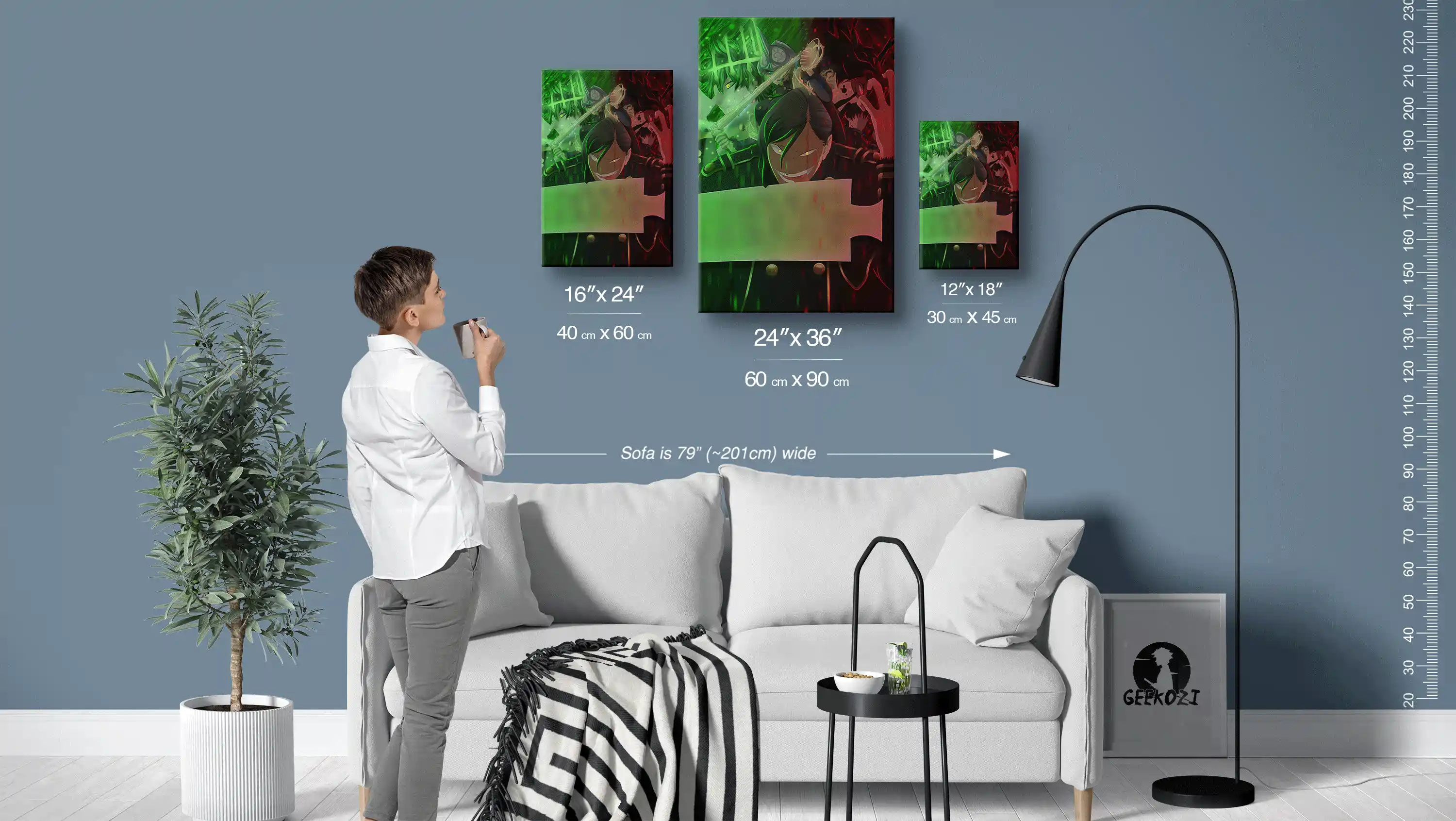 The Menacing Death Scythe Showdown adds a striking touch to any room with its bold design, available in three sizes: 12×18 (30×45 cm), 16×24 (40×60 cm), and 24×36 (60×90 cm). To help you gauge the scale, the sofa in the image above is 79 inches (approximately 201 cm) wide. For smaller spaces like desks or bedside tables, the 12×18 size works well, while the larger 24×36 size makes a dramatic statement on feature walls. Choose the size that best fits your space to ensure the artwork complements your decor beautifully.