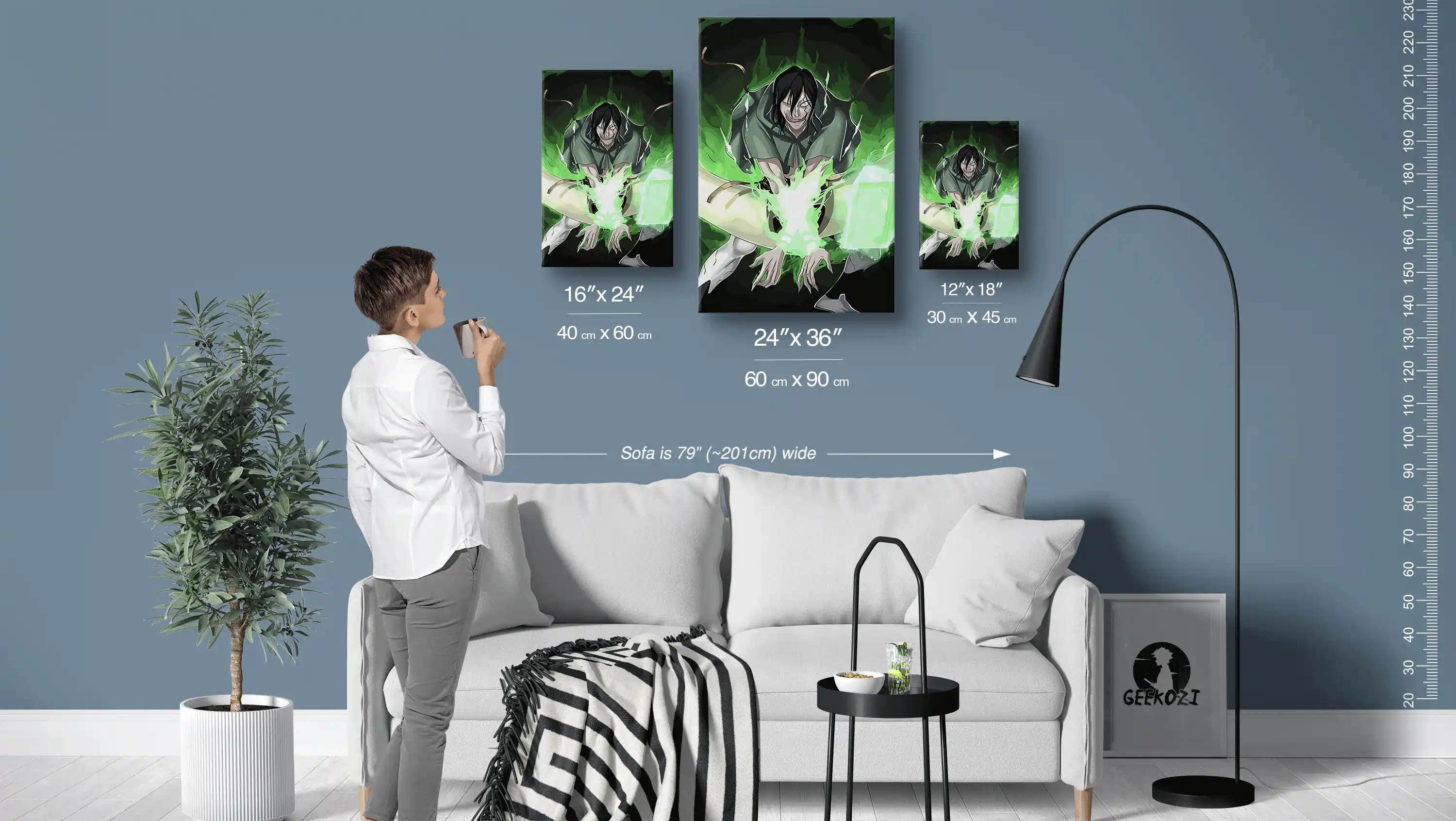 The Sinister Green Slash Magic offers a striking addition to your space, available in three panel sizes: 12×18 (30×45 cm), 16×24 (40×60 cm), and 24×36 (60×90 cm). To help you visualize, the sofa in the image above is 79 inches wide, which is about 201 cm. For a small desk, the 12×18 size works well, while the 24×36 option is perfect for creating a stunning feature wall. Choosing the right size can really make a difference in how the art complements your room, so consider the scale of your space when deciding.