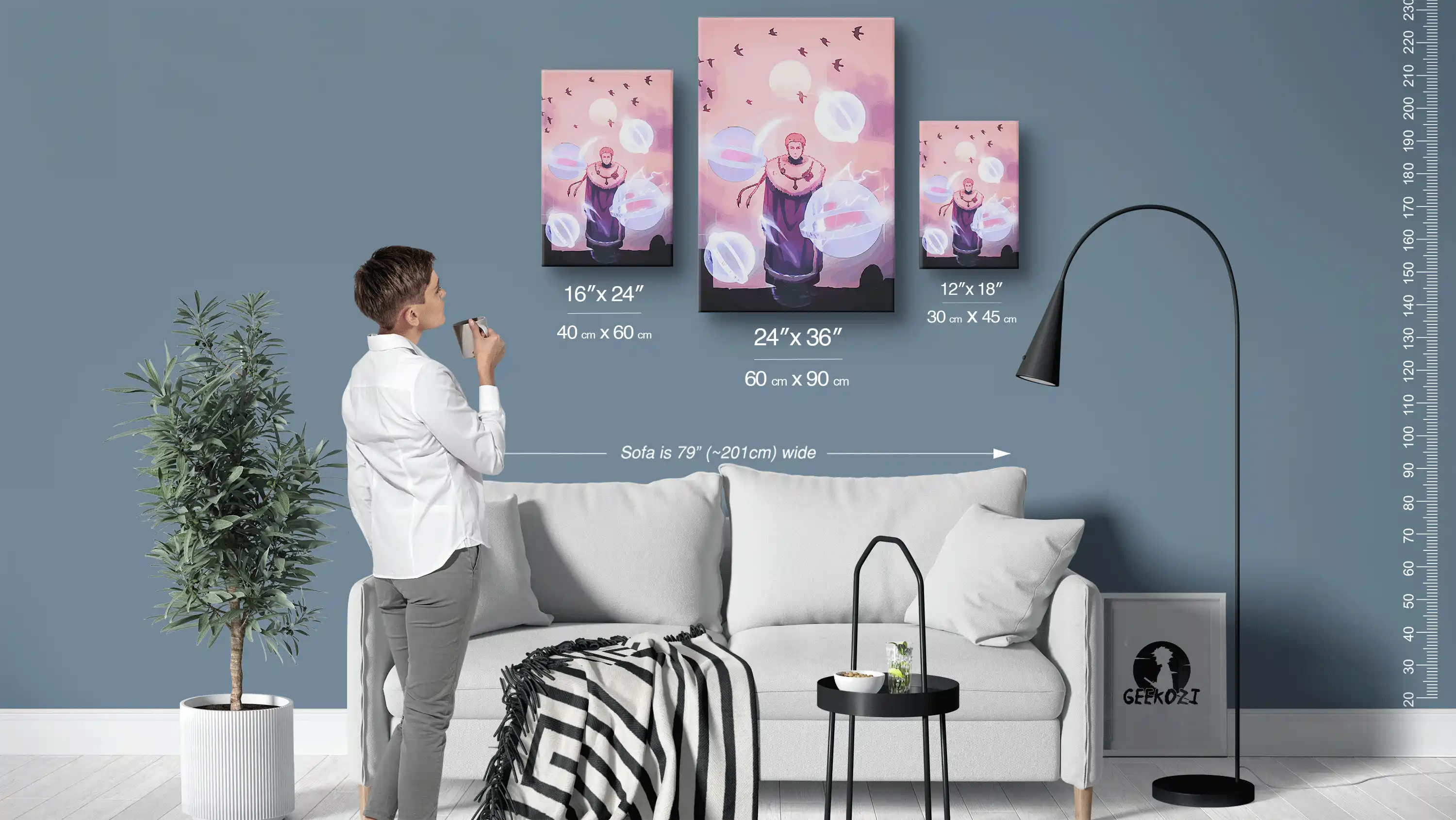 Transform your space with the Dreamlike Aura with Floating Orbs, available in three stunning panel sizes: 12×18 (30×45 cm), 16×24 (40×60 cm), and 24×36 (60×90 cm). The sofa shown above is 79 inches wide, giving you a sense of scale for your choice. For smaller areas like desks or college dorms, the smallest size can work wonders, while the largest option can serve as a centerpiece for expansive feature walls. Each size option brings its unique charm, allowing you to create the perfect ambiance in any room.