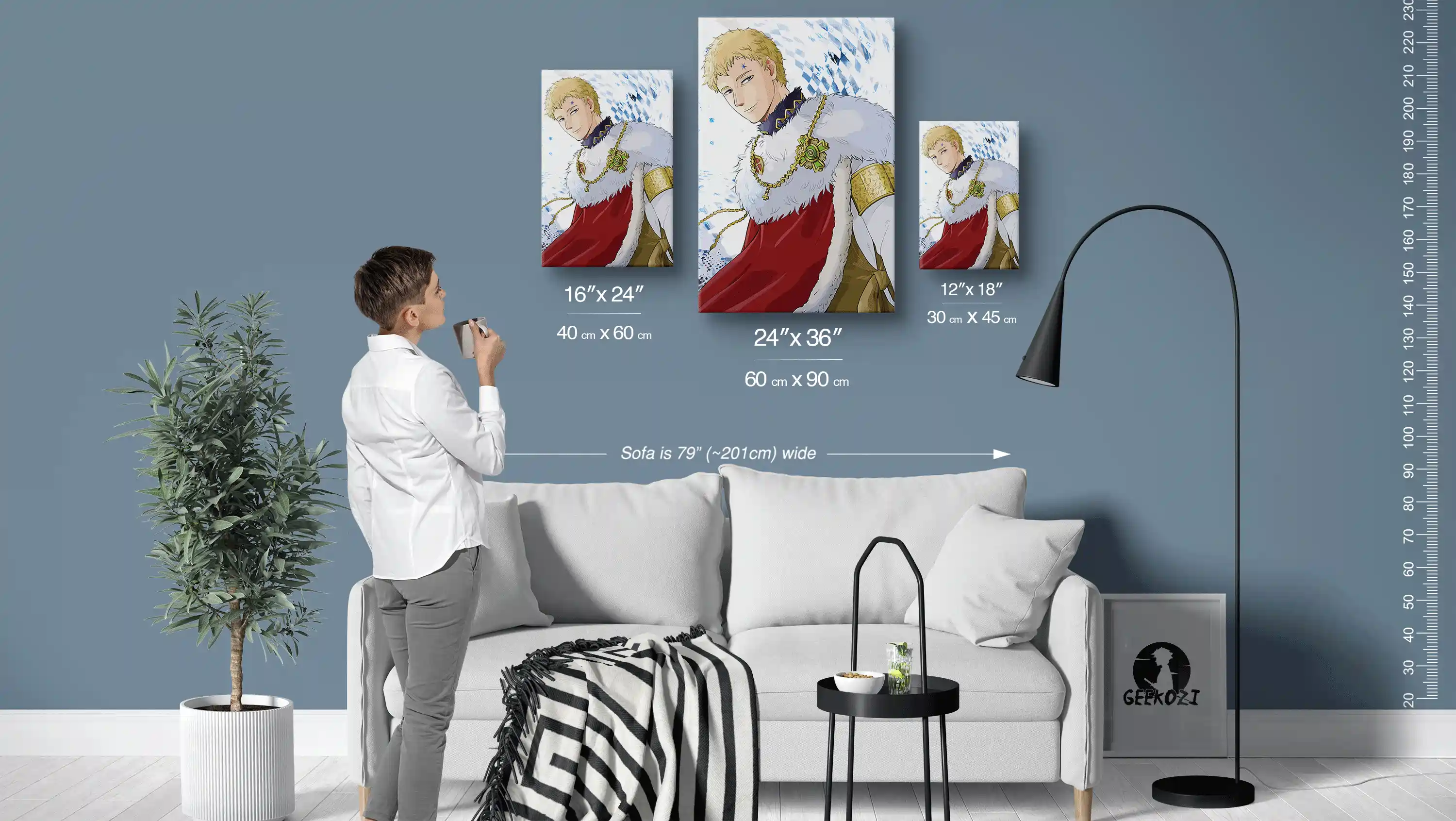 The Ethereal Time Burst brings a touch of anime-inspired elegance to your space, available in three panel sizes: 12×18 (30×45 cm), 16×24 (40×60 cm), and 24×36 (60×90 cm). As you can see in the image above, the sofa is 79 inches (approximately 201 cm) wide, which helps you visualize how each size will fit in your home. For smaller areas like desks or cozy corners, the 12×18 size works beautifully, while the 24×36 option makes a striking statement on feature walls. Choose the size that complements your space best and fits your style.