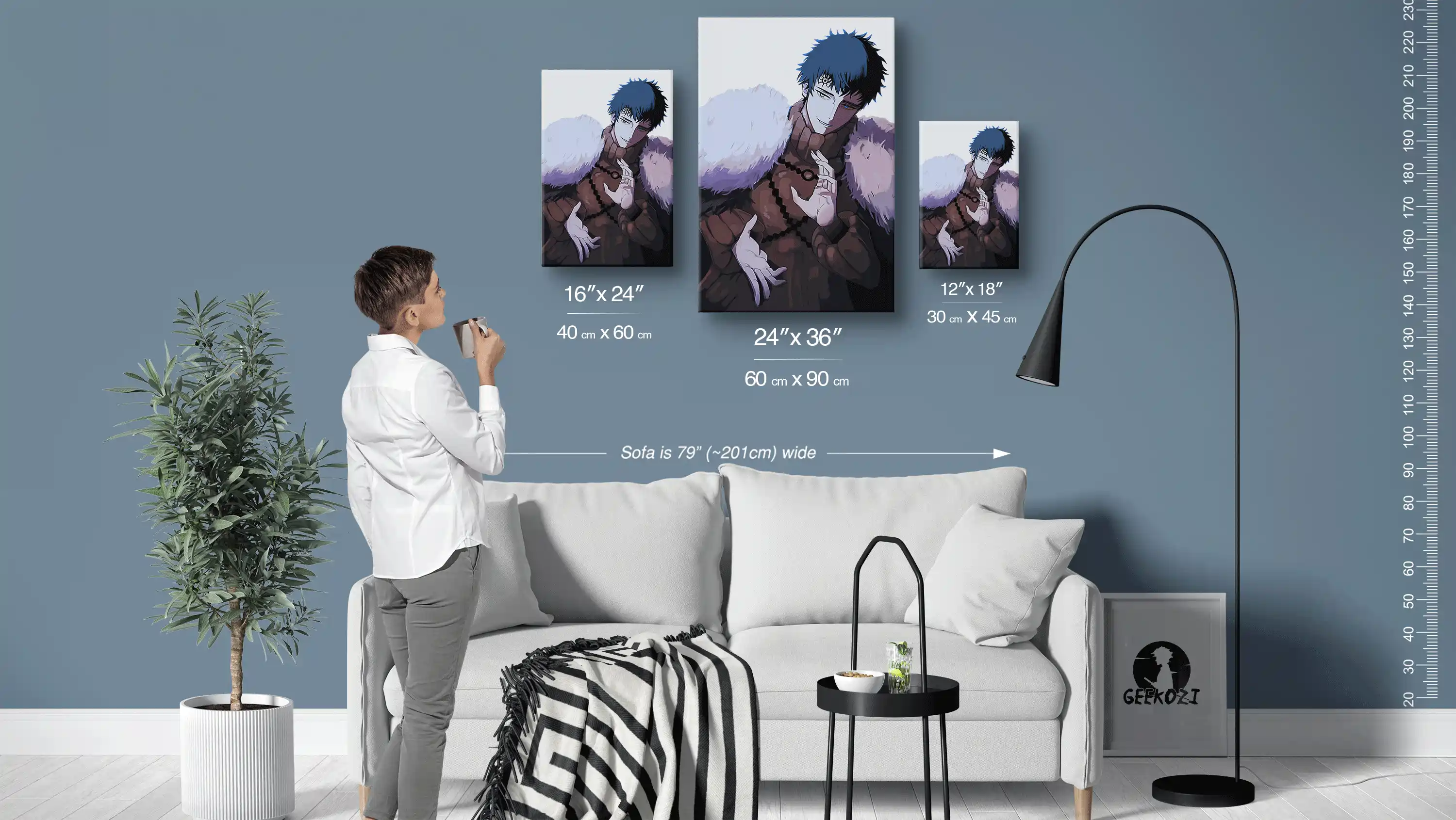 The Mysterious Gaze Close Up is a stunning addition to any space, available in three sizes: 12×18 (30×45 cm), 16×24 (40×60 cm), and 24×36 (60×90 cm). To help you visualize, the sofa in the image above is 79 inches (approximately 201 cm) wide. When choosing the right size, consider using the smallest panel for desks and the largest for a striking feature wall that captures attention. This art piece not only showcases your love for anime but also adds a unique touch to your decor, making it a fantastic conversation starter.