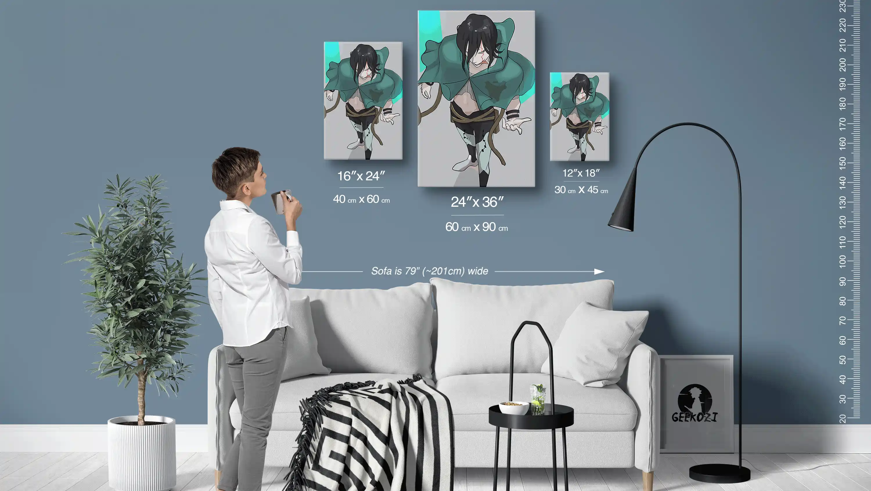 The Mystery Cloak and Crimson Eyes artwork brings an enchanting vibe to any space, available in three panel sizes: 12×18 (30×45 cm), 16×24 (40×60 cm), and 24×36 (60×90 cm). For reference, the sofa shown above measures 79 inches (approximately 201 cm) in width, helping you visualize how the artwork will fit into your room. If you’re looking to brighten up a small desk area, the smallest size works perfectly, while the largest is ideal for creating a stunning focal point on feature walls. Choose the size that best complements your space to create the perfect atmosphere.