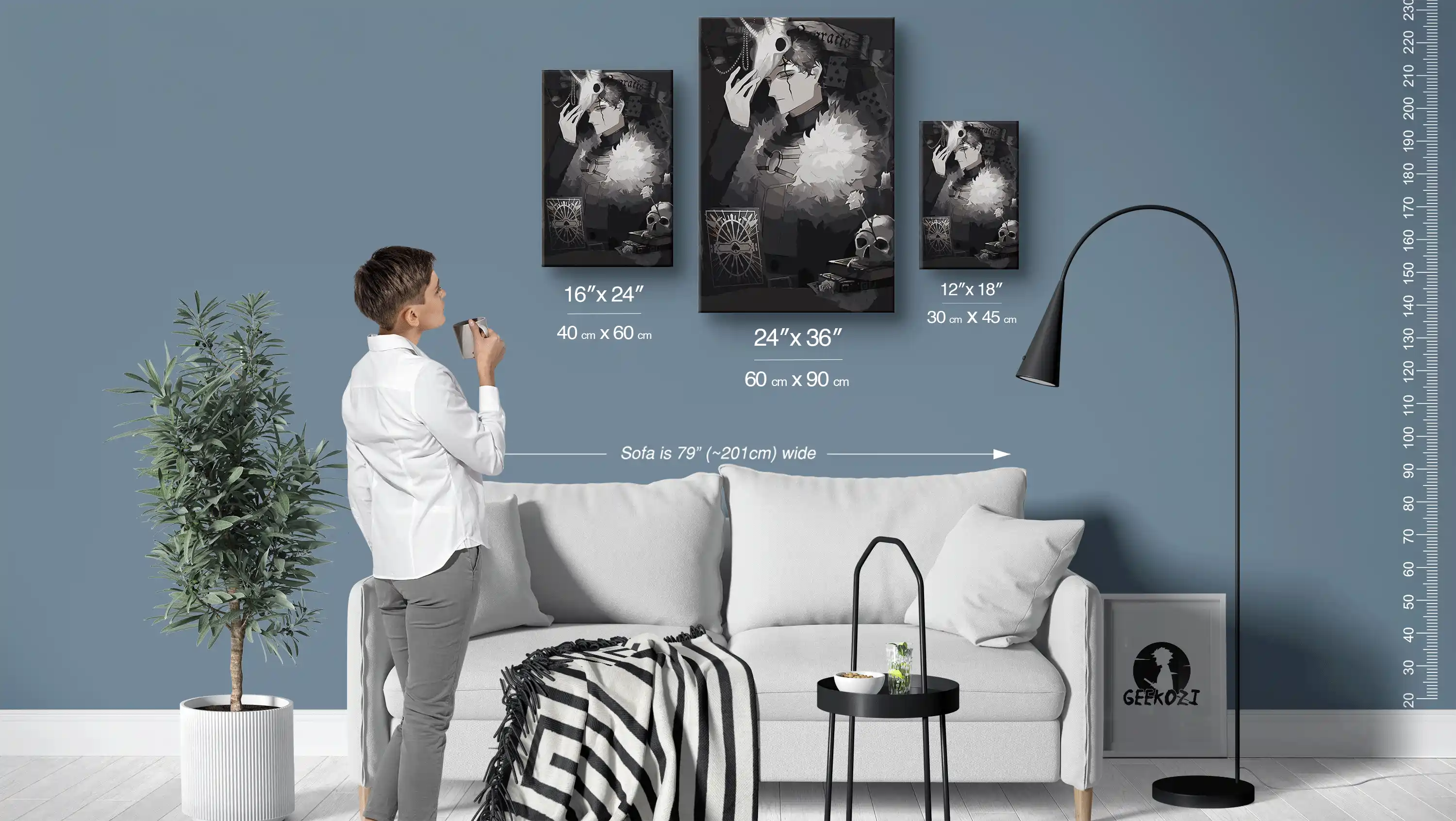 The Enigmatic Mask Reveal is a stunning piece of metal wall art that comes in three sizes: 12×18 (30×45 cm), 16×24 (40×60 cm), and 24×36 (60×90 cm). To help you visualize the scale, the sofa in the image above is 79 inches (approximately 201 cm) wide. If you want to add a touch of art to a smaller space like a desk or bookshelf, the smallest size works perfectly. For larger areas, such as a feature wall in your living room, consider opting for the largest option to make a striking statement.