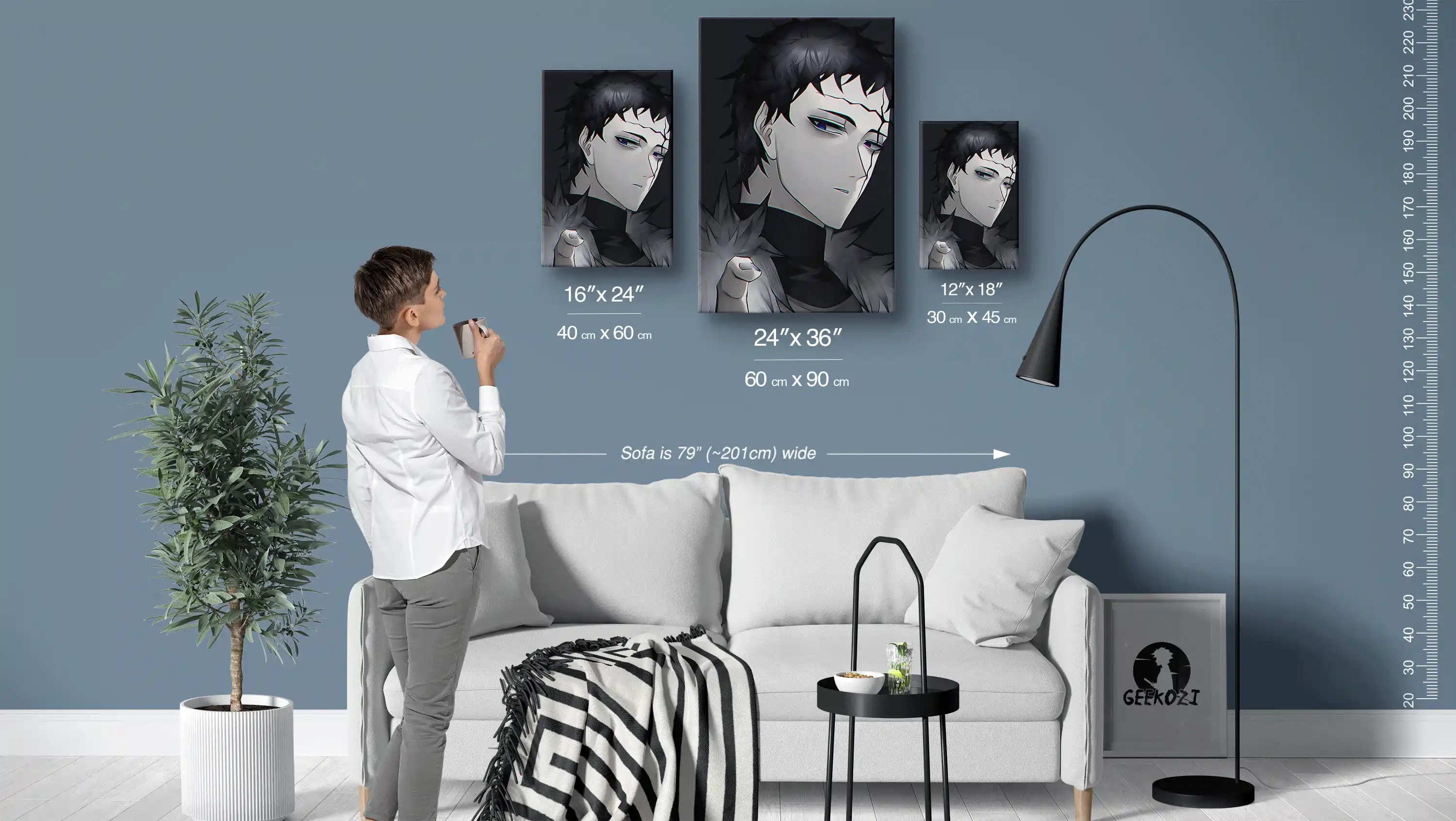 The Mystery Aura Striking Pose is a captivating piece of wall art that you can choose in three panel sizes: 12×18 (30×45 cm), 16×24 (40×60 cm), and 24×36 (60×90 cm). To help you visualize its impact, keep in mind that the sofa shown above is 79 inches (approximately 201 cm) wide. For smaller spaces or desks, the 12×18 size works well, while the larger 24×36 option is perfect for making a statement on feature walls. Each size offers a unique way to showcase your love for anime and metal art, bringing a dynamic flair to your home.
