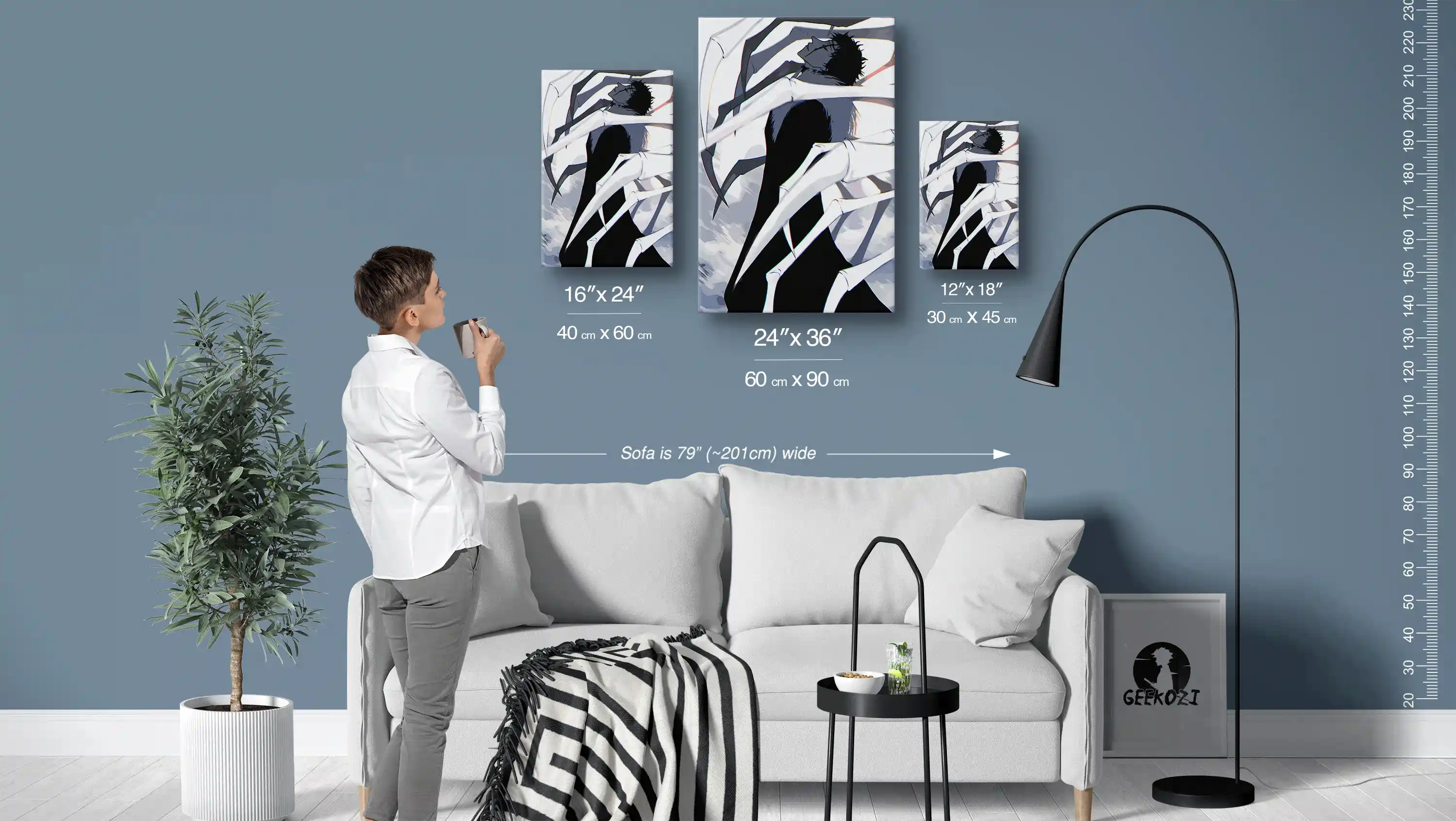 The Serene Bone Magic Encounter is a stunning choice for anime enthusiasts looking to elevate their space. Available in three panel sizes, 12 inches by 18 inches, 16 inches by 24 inches, and 24 inches by 36 inches, it fits perfectly on any wall. To give you an idea of scale, the sofa in the image above is 79 inches wide. If you’re looking to add a piece to a desk or smaller area, the smallest size works well, while the largest size makes a striking statement on feature walls. Choose the size that best suits your space and style preferences.